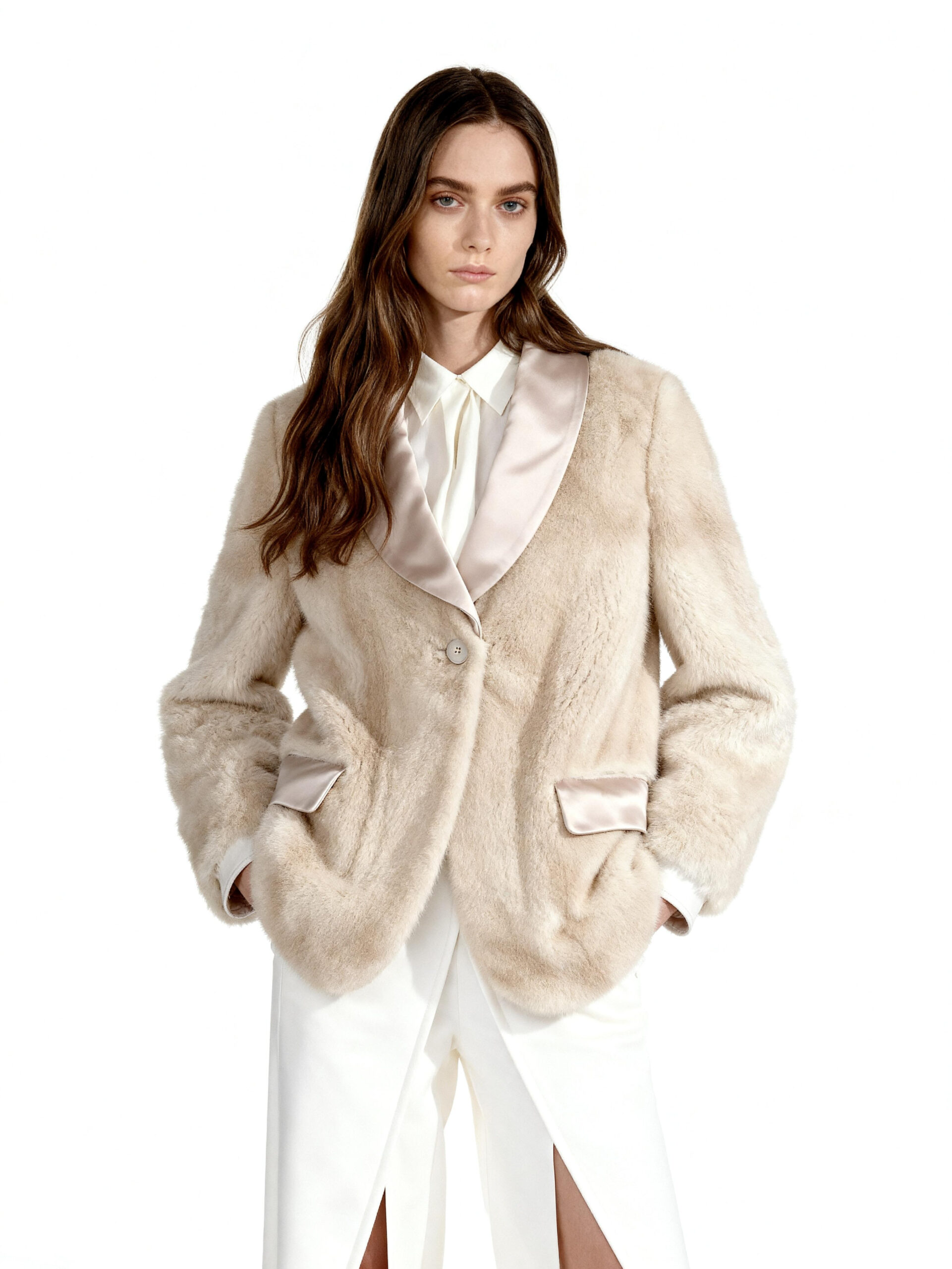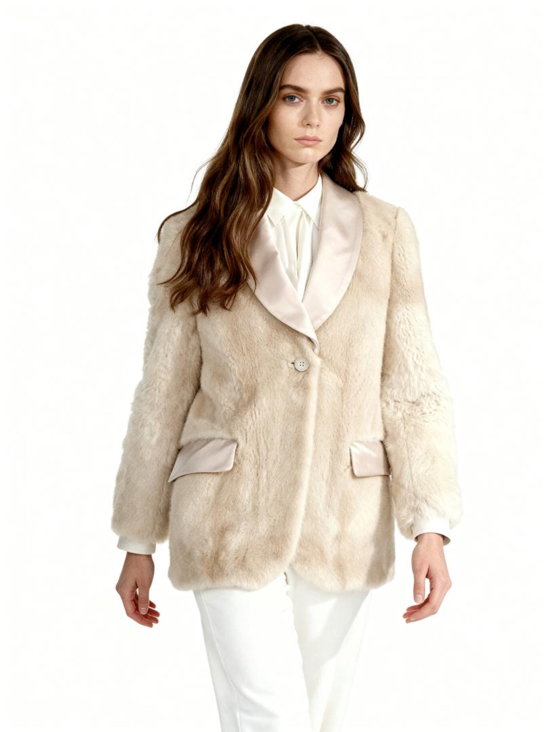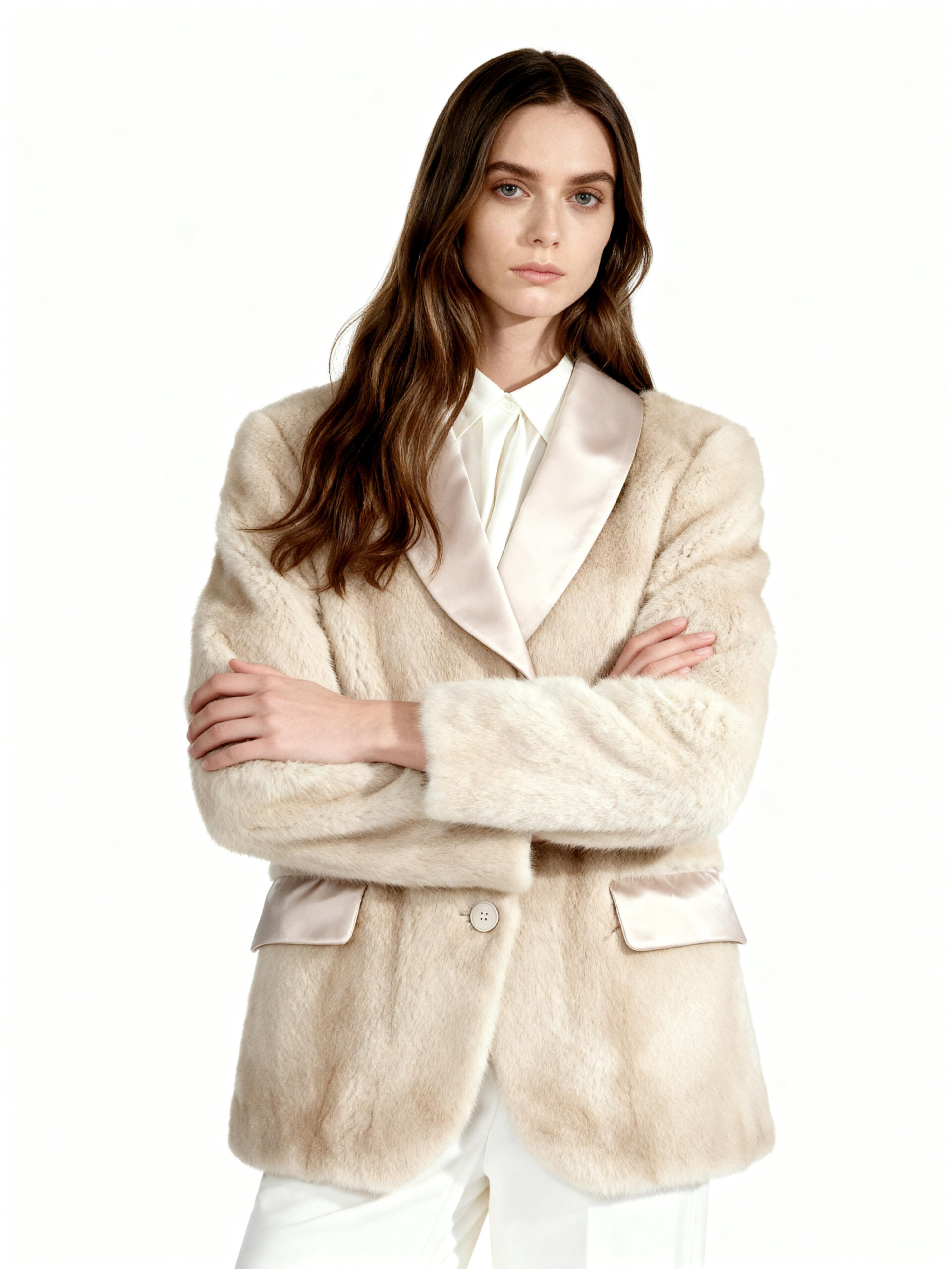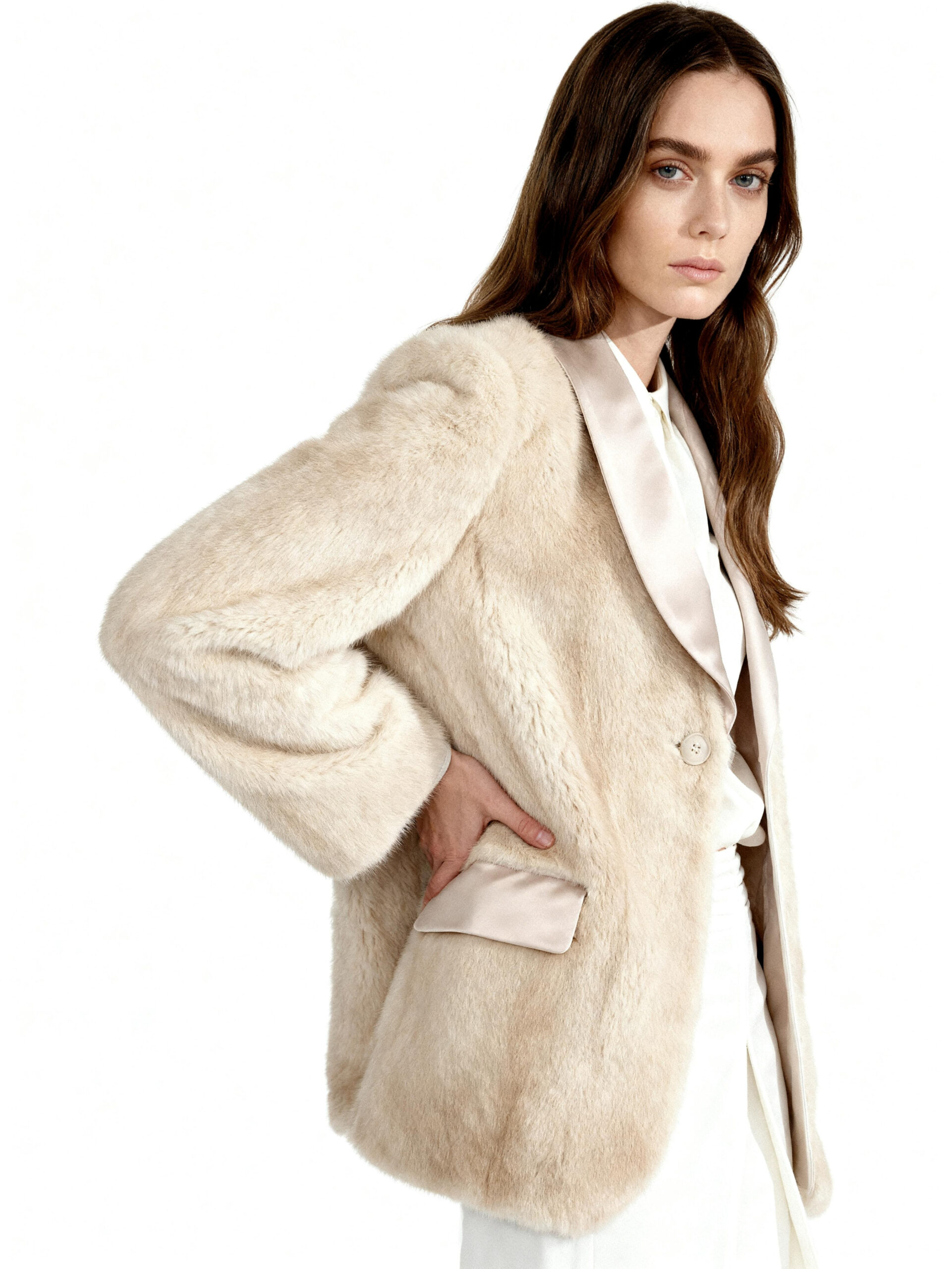 The Beige Faux Mink Blazer Jacket elevates classic workwear into the realm of modern luxury.