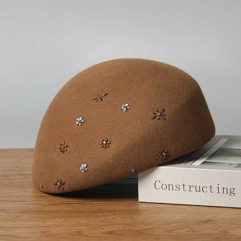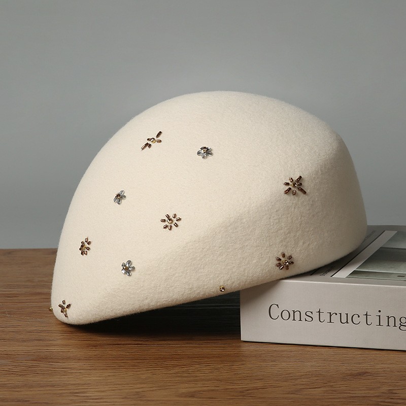 Crafted from 100% wool felt, this beret delivers warmth, softness, and structure. Scattered with delicate embroidered bead patterns in muted gold and blue tones, it adds subtle sparkle without overpowering minimalist elegance. Ideal for boutique collections and winter style edits seeking sophisticated charm.