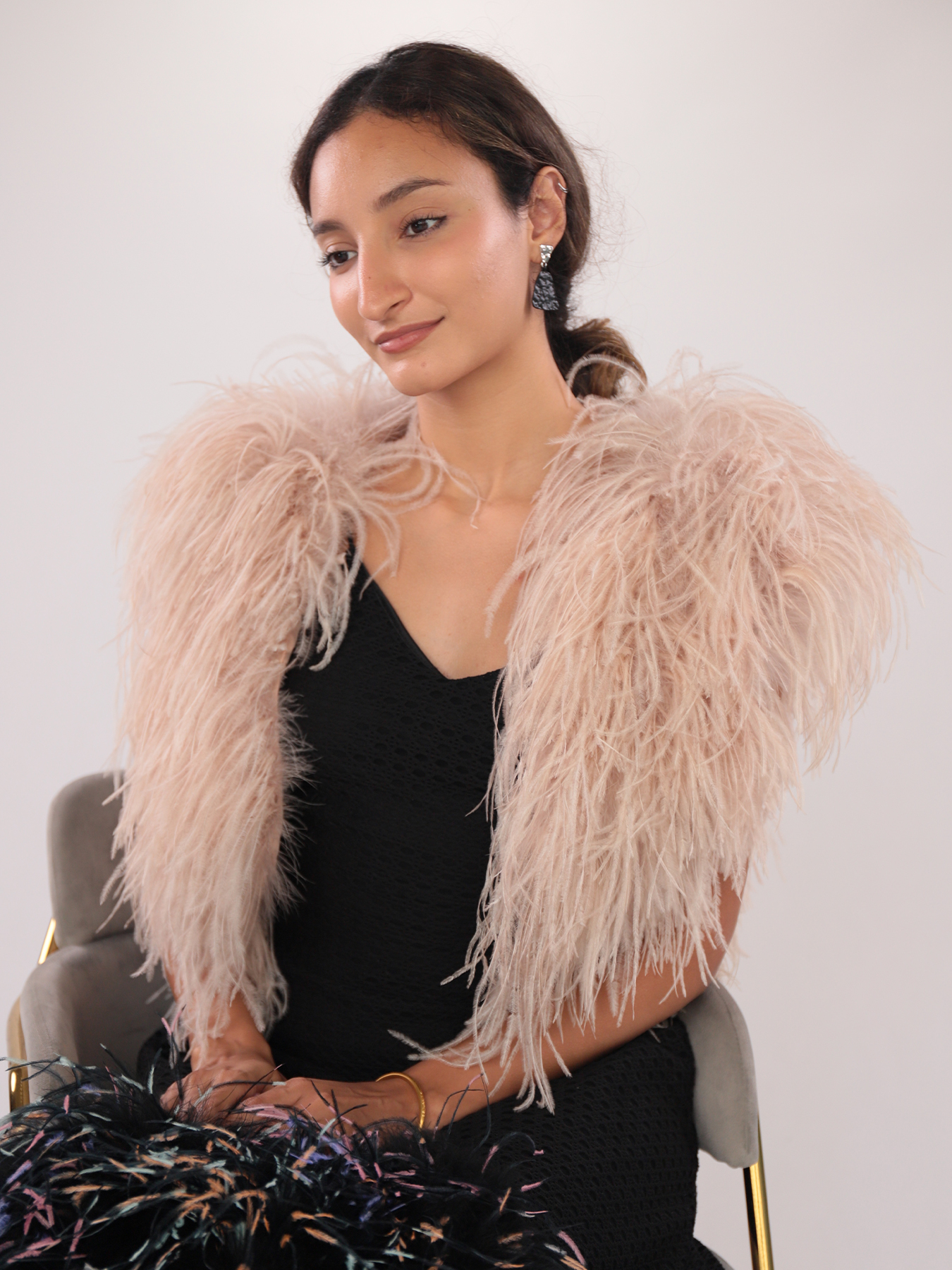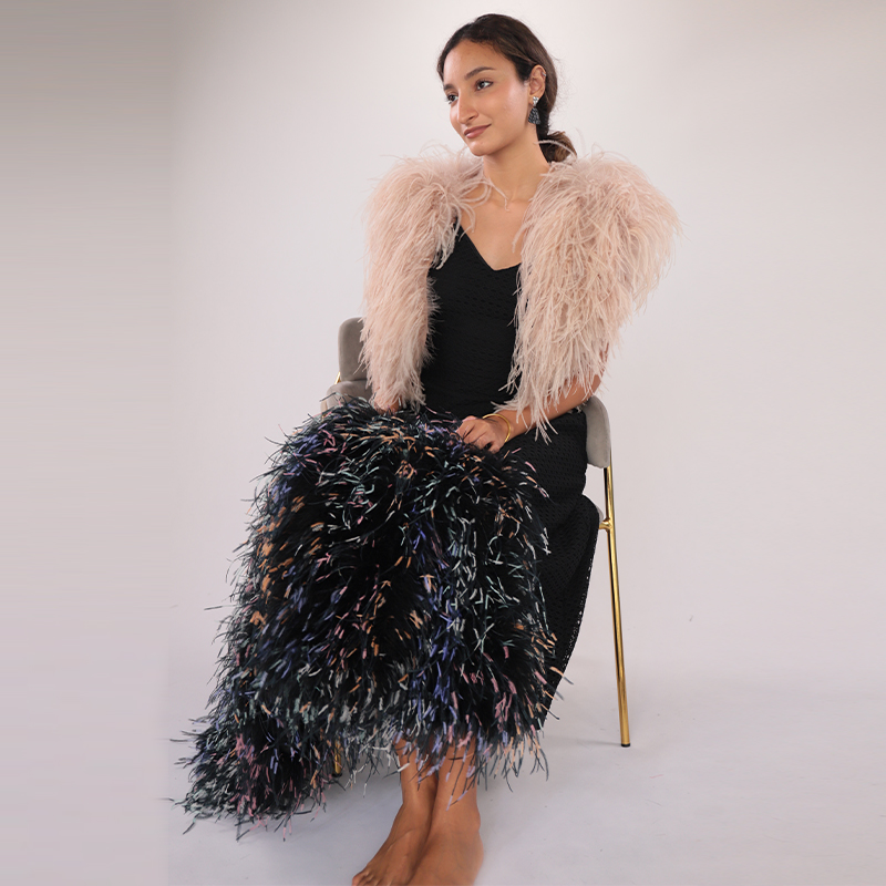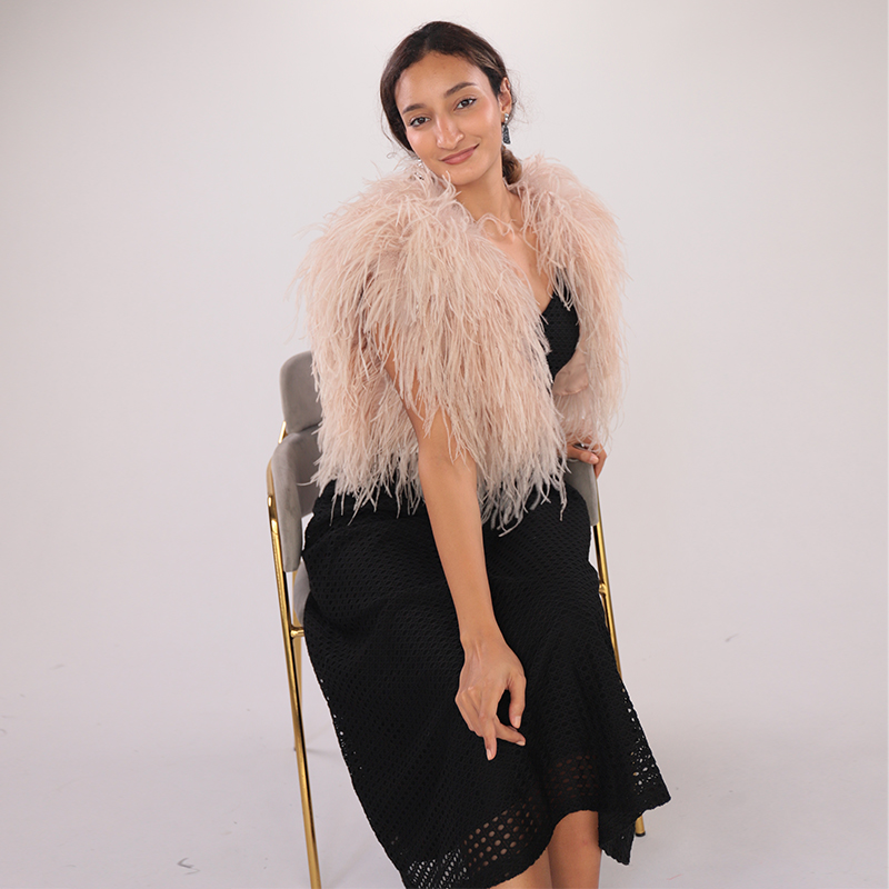 The Real Ostrich Feather Shawl brings couture softness to shoulders, blending modern glamour with natural movement. Each plume is hand-applied to ensure even volume and texture, while the blush tone offers subtle warmth that complements both neutral and dramatic styling.