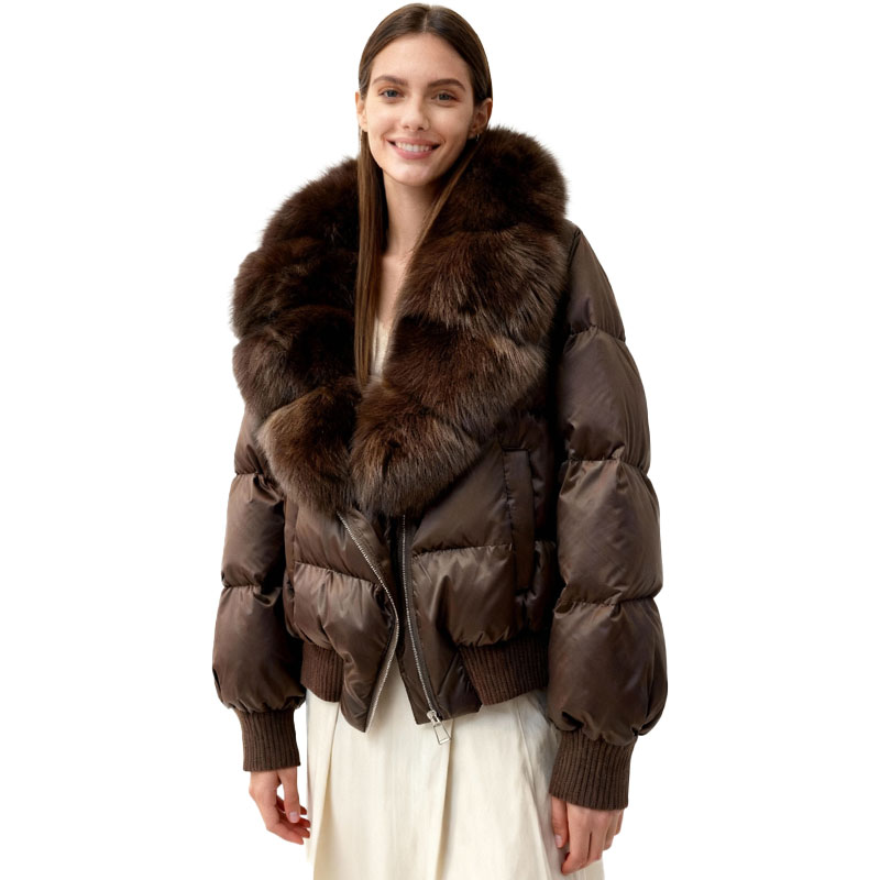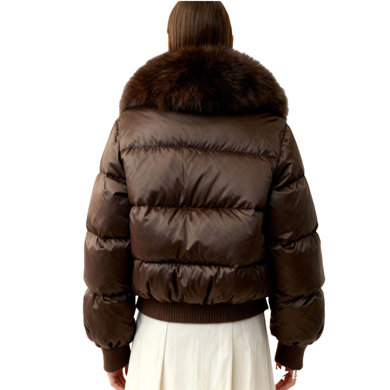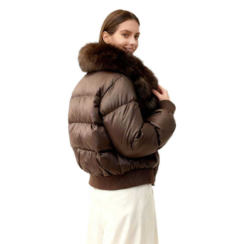 This fashion-forward bomber jacket features a silky brown shell filled with premium down insulation, wrapped with an ultra-soft and voluminous fox fur collar in rich chestnut. The cropped design and ribbed hem and cuffs balance structure with ease, delivering an effortless winter look for upscale markets and influencers alike.