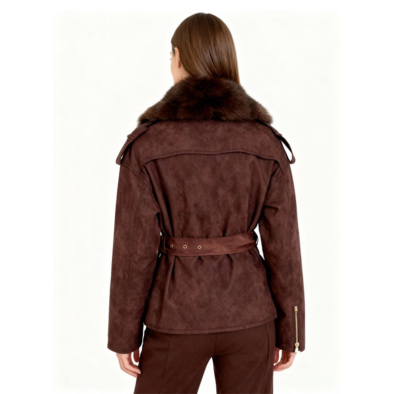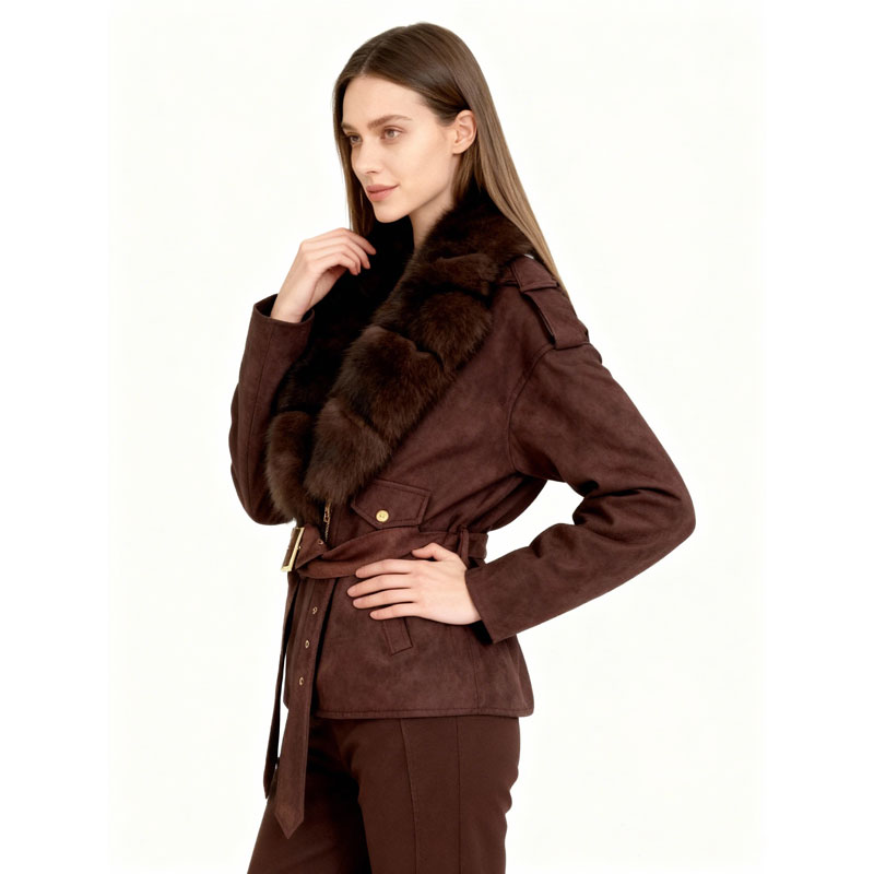 Crafted from premium suede, this structured coat features a dramatic oversized collar and cuffs made from authentic fox fur, offering warmth and elevated elegance. With a belted waist and minimalist silhouette, it’s ideal for winter luxury edits.