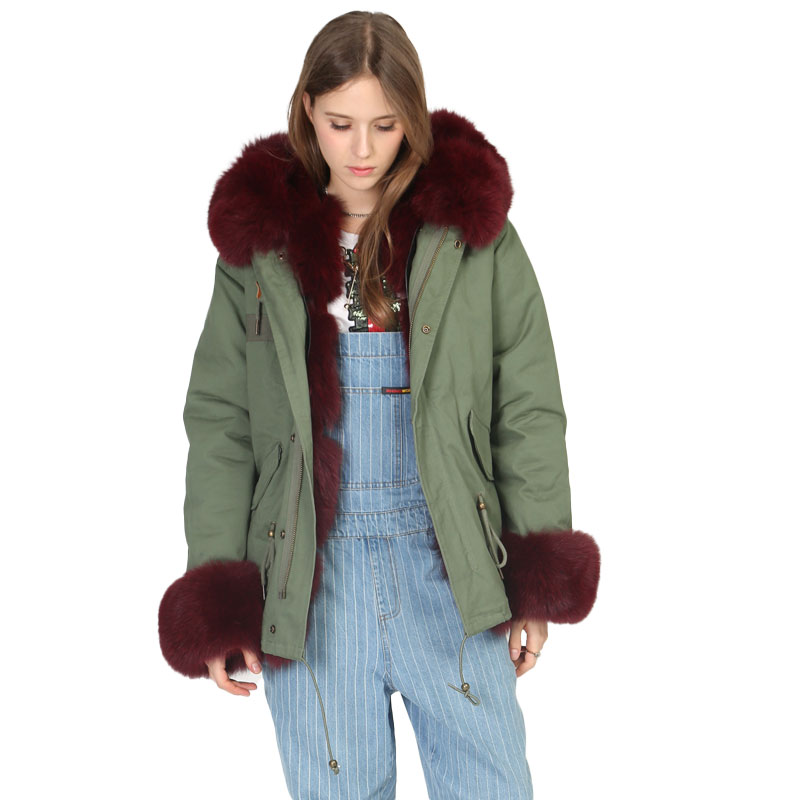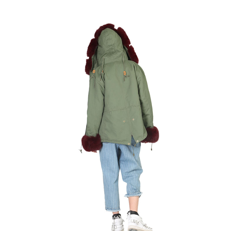 A luxurious blend of function and fashion, this parka features a rich burgundy real fox fur lining paired with a classic army green cotton outer shell. The deep, warm tone of the fur contrasts elegantly with the rugged exterior, creating a timeless piece that combines winter protection with runway-ready appeal. The fully lined interior, including the cuffs and hood, offers high insulation and can be detached for versatile seasonal use.