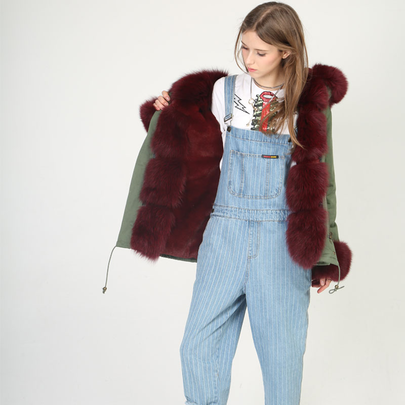 Full-body burgundy fox fur lining