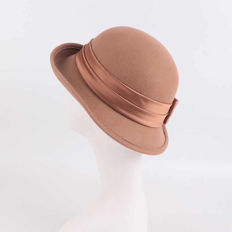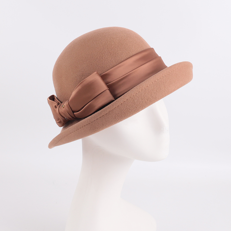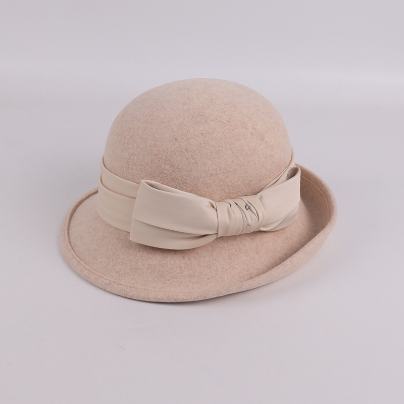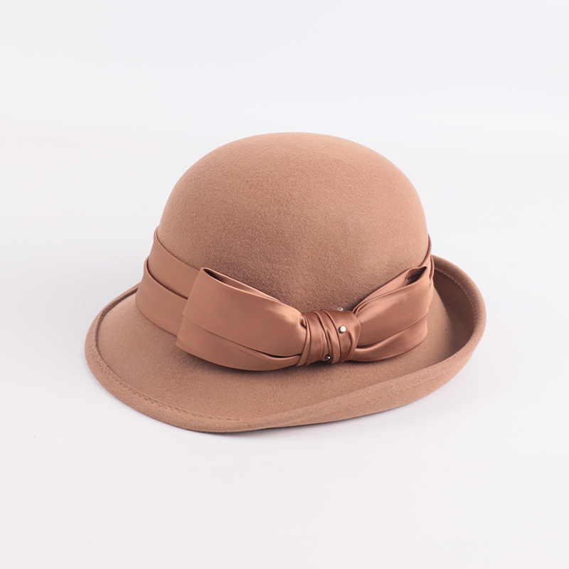 A sophisticated blend of vintage elegance and modern femininity. This 100% wool bucket hat features a rich burgundy hue and a silky satin ribbon bow, ideal for retailers targeting timeless, chic winter accessories.