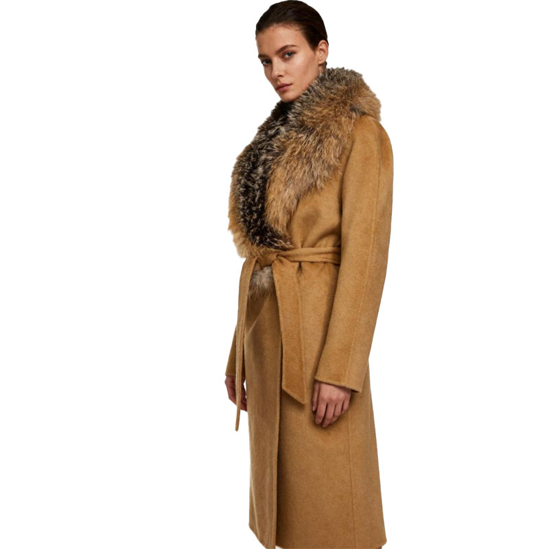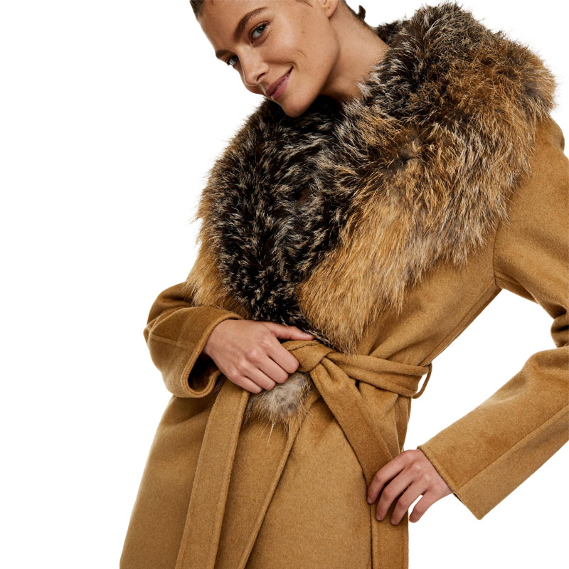 Classic camel trench-style coat in 100% premium wool, finished with a luxurious oversized fox fur shawl collar. Designed for upscale winter collections, combining warmth, texture, and timeless luxury.