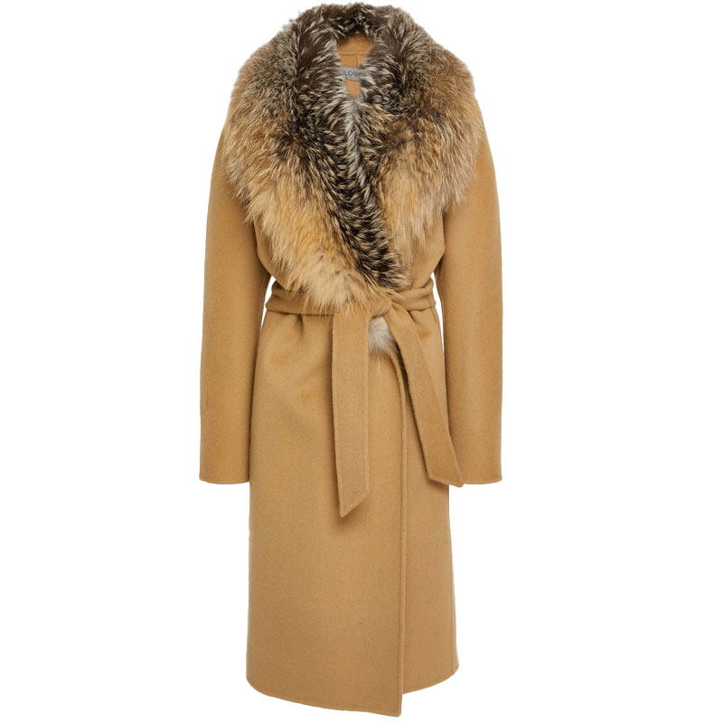 This knee-length wool coat exudes understated elegance with its clean silhouette, self-tie belt, and natural fox fur collar. The plush texture of the fur adds dimension and warmth, perfect for retail buyers seeking a versatile statement piece for winter assortments.