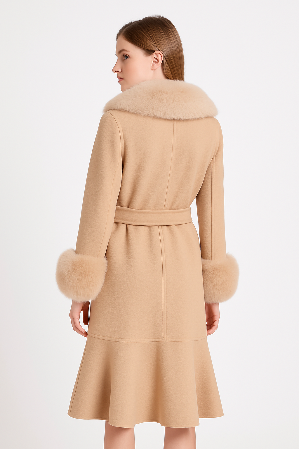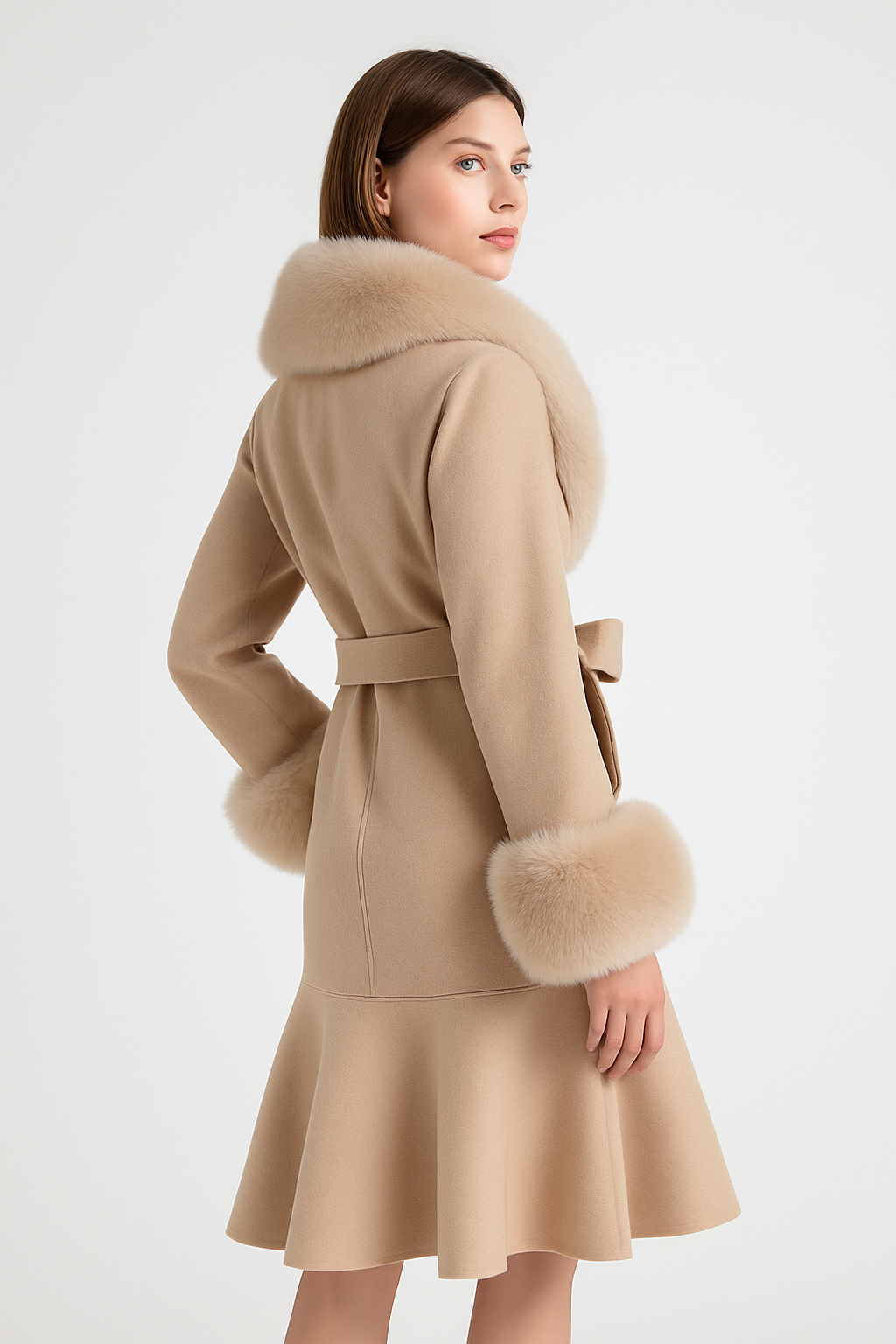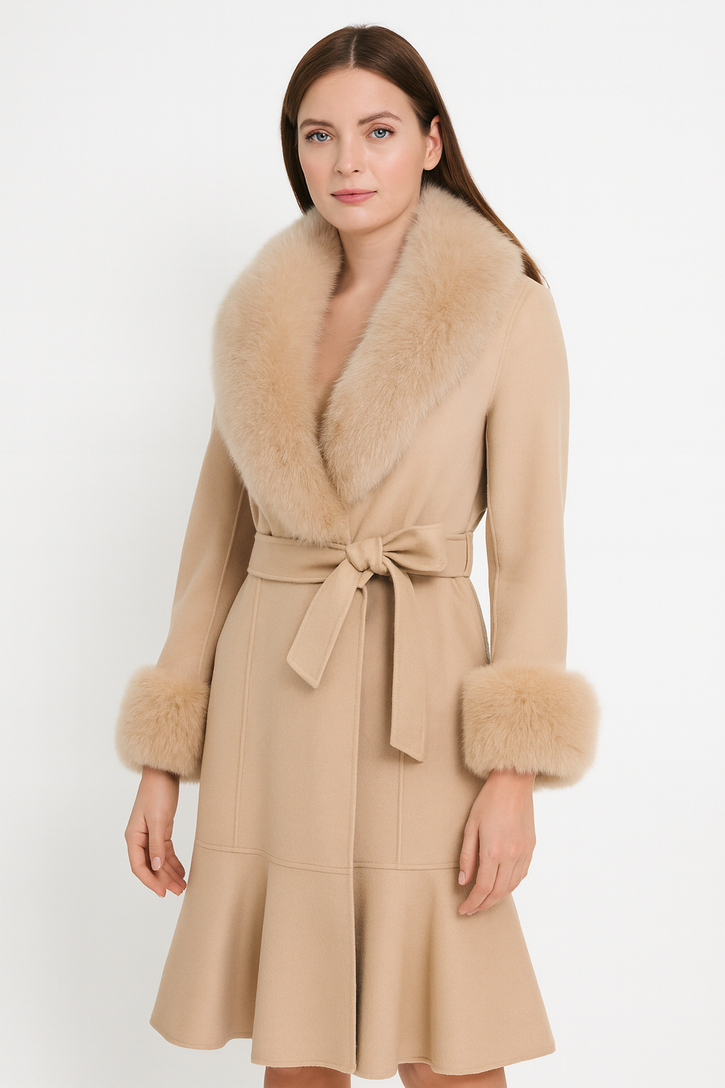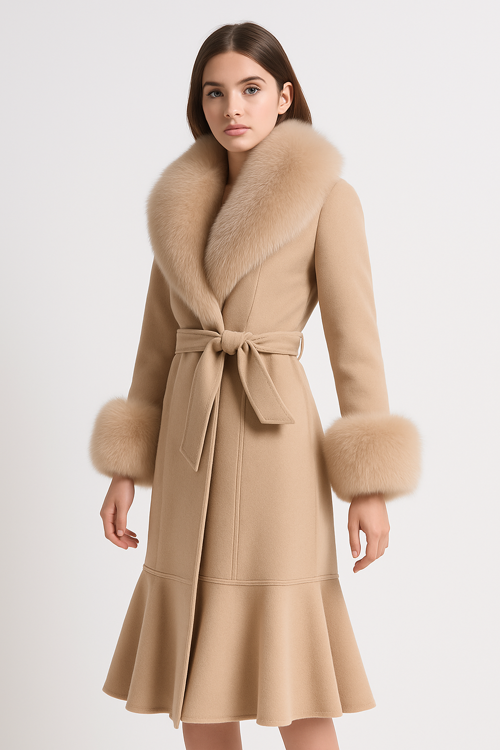 A stunning silhouette designed for modern European elegance — this wool trench with plush fox fur accents is a winter wardrobe staple for young ladies who love timeless style with a luxury twist.