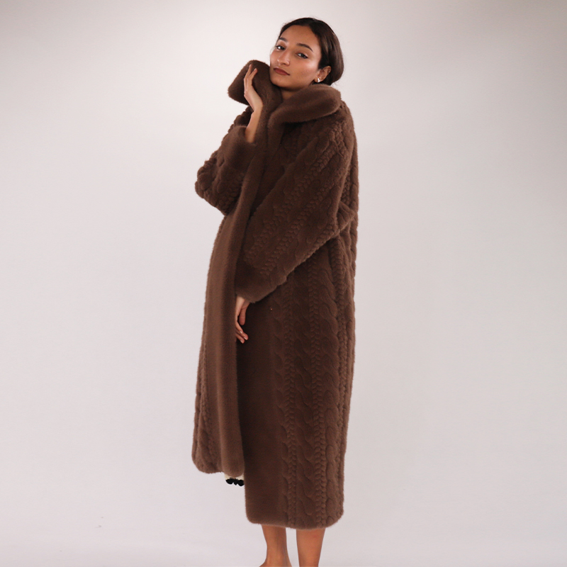 A statement winter staple in rich chocolate tones, this long faux fur coat features luxurious softness and subtle braided accents—crafted for premium outerwear collections.