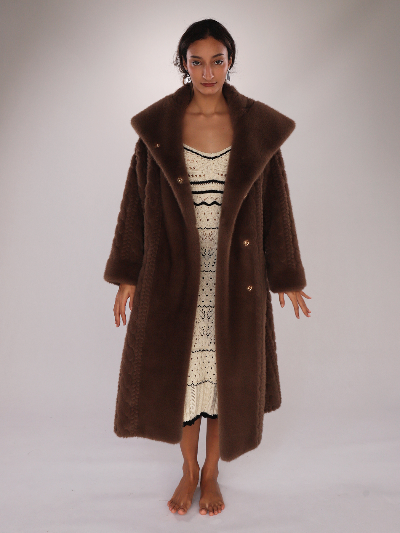 This elegant full-length coat is designed in a deep cocoa brown hue with ultra-soft faux fur. The wide lapel collar exudes classic glamour, while the unique braided-texture trims along the front and sleeves add a refined handcrafted touch. Double-breasted button closure ensures a tailored silhouette with timeless appeal.