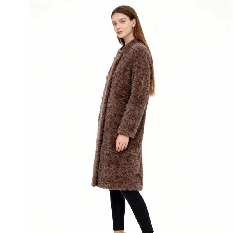 This full-length shearling coat is made from authentic curly lamb fur, delivering natural insulation and ultra-soft handfeel. Its structured, clean silhouette is punctuated by gold-tone buttons, merging traditional tailoring with cozy volume. Perfect for both classic wardrobes and trend-aware collections.
