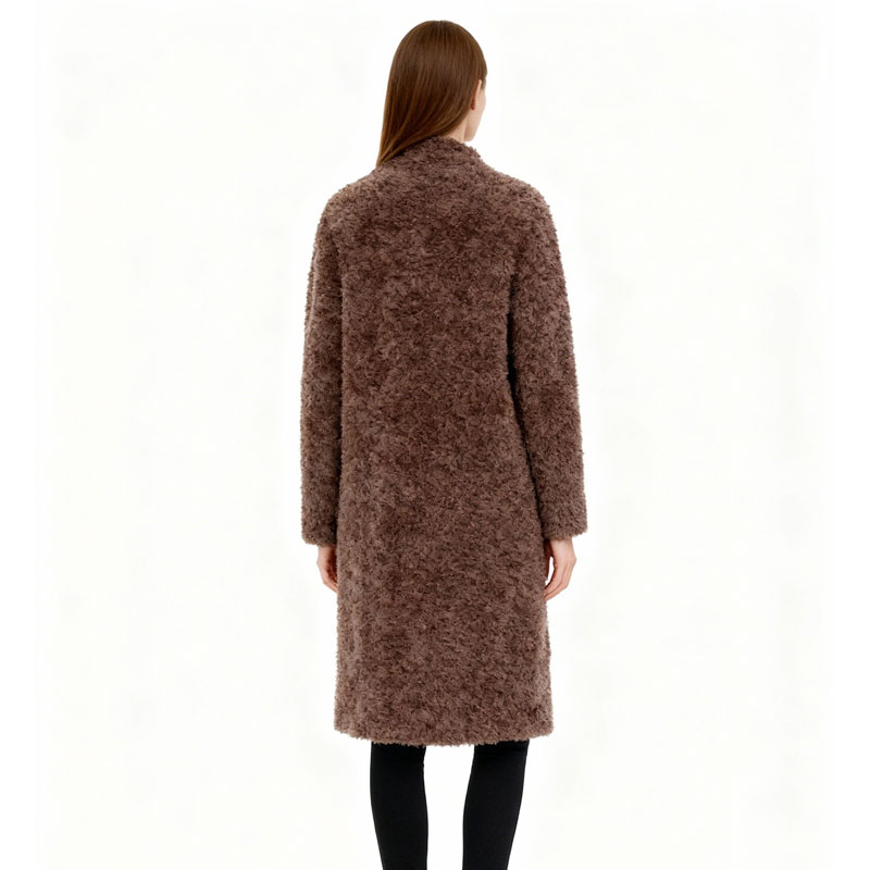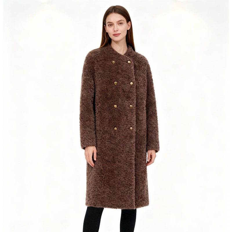 Minimalist meets luxury in this double-breasted long shearling coat, crafted from rich chocolate brown real sheep fur. A timeless winter staple with elevated textural warmth and refined detailing, ideal for upscale outerwear collections.