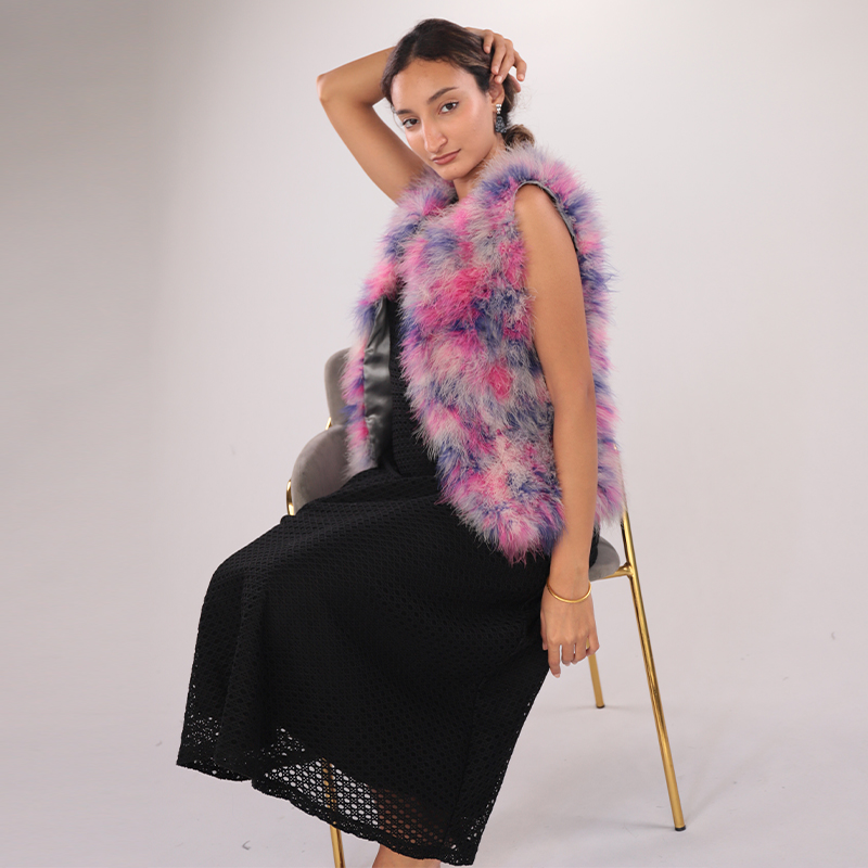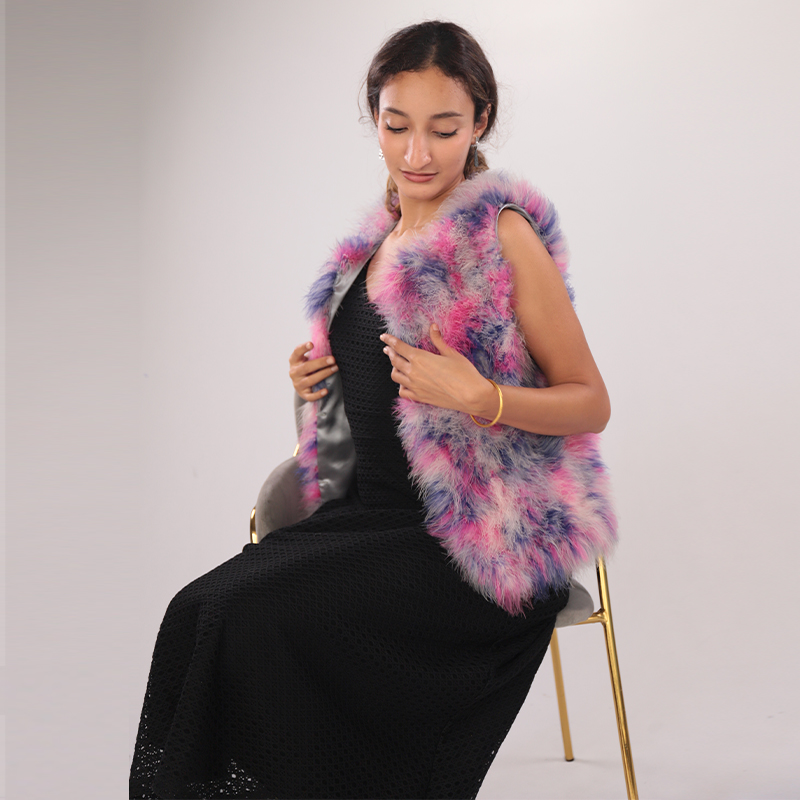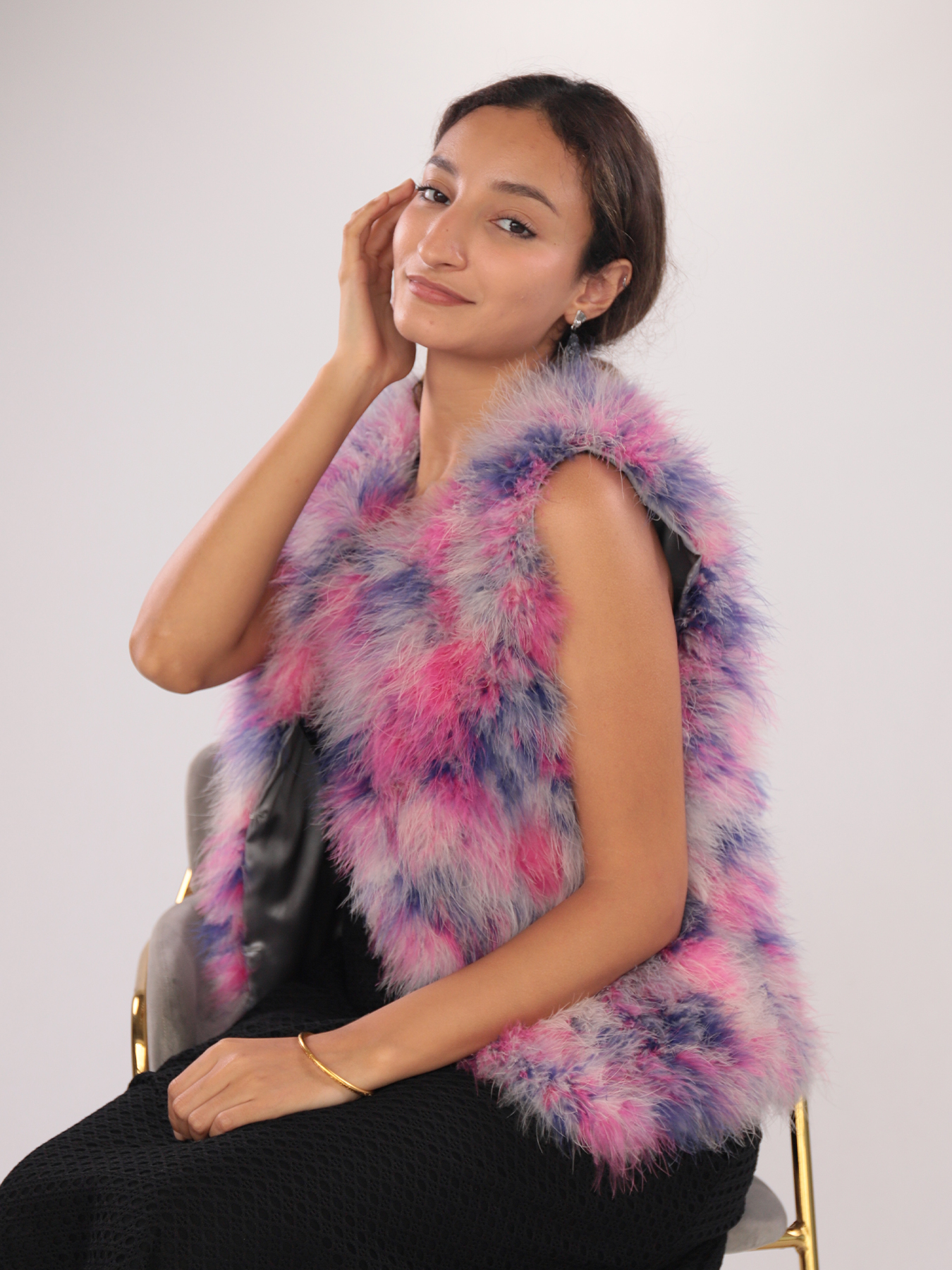 This vibrant turkey feather vest is an eye-catching statement piece, blending rich tones of pink, purple, and soft blue for a bold yet playful look. Crafted from ethically sourced real turkey feathers, this sleeveless vest delivers lightweight warmth, luxurious texture, and an unforgettable silhouette — ideal for fashion-forward collections and editorial styling.