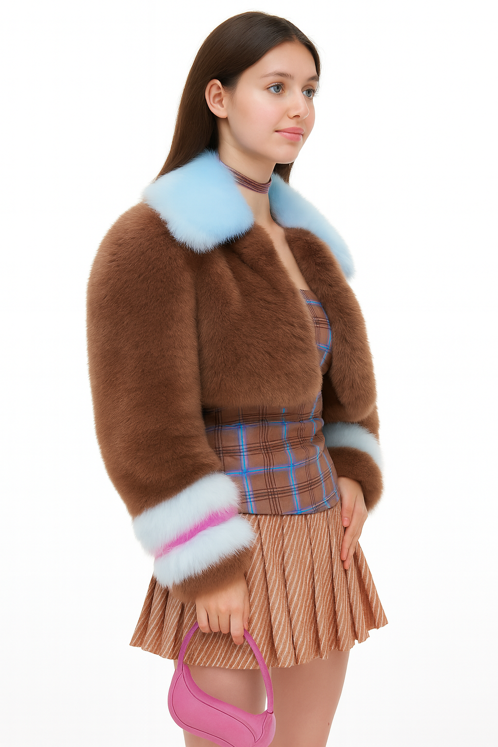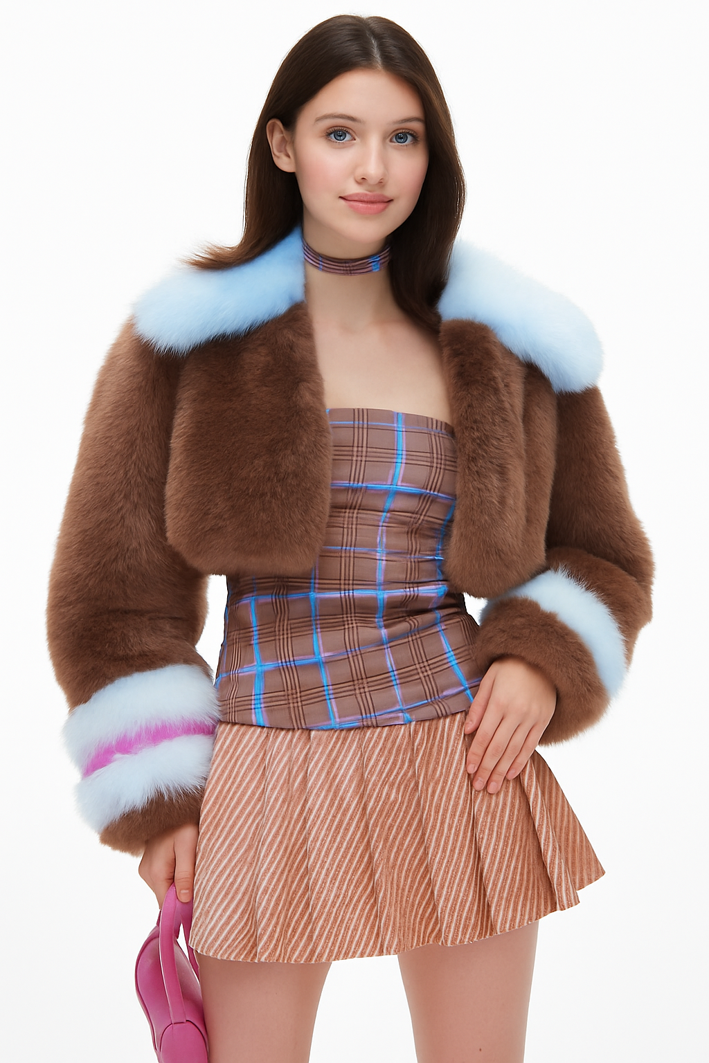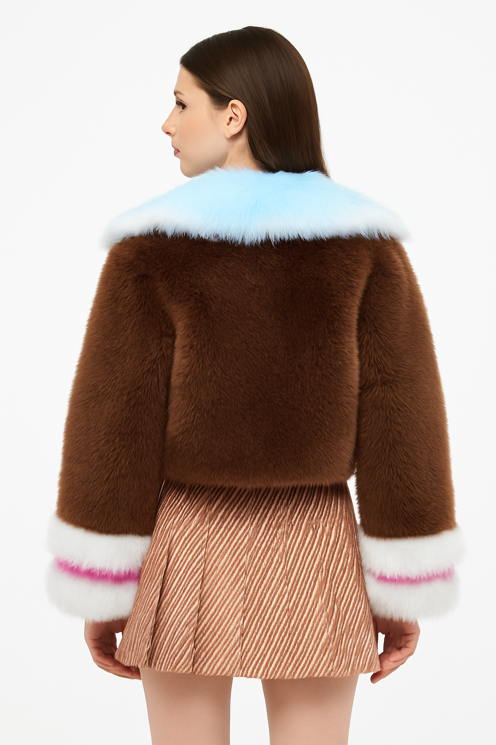 This eye-catching cropped coat is crafted from ultra-soft, high-pile faux fur in rich mocha brown, contrasted with pastel blue cuffs and collar. A vibrant magenta stripe at the wrist adds an unexpected twist, evoking early-2000s energy with a modern luxury update. Perfect for stylists, influencers, and trend-led retailers, this piece elevates any outfit with its bold color-blocking and tactile appeal.
