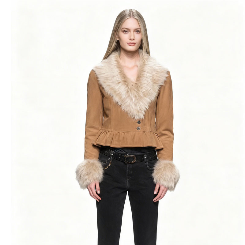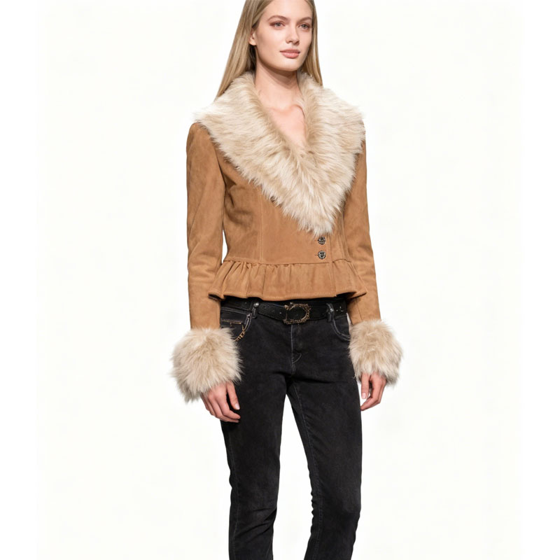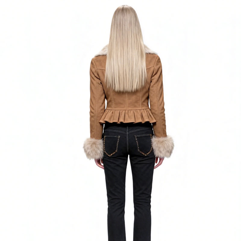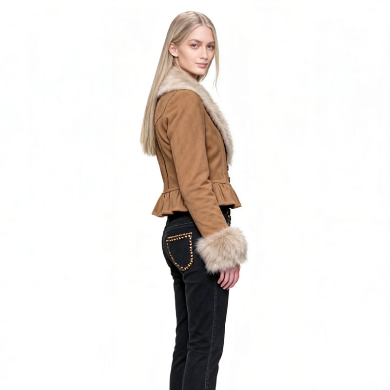 Crafted from soft, camel-toned suede and trimmed with voluminous natural fox fur at the collar and cuffs, this jacket offers a flattering tailored fit and fashion-forward edge. The flared peplum hem and decorative buttons enhance its feminine silhouette. Perfect for winter layering with an elegant touch.
