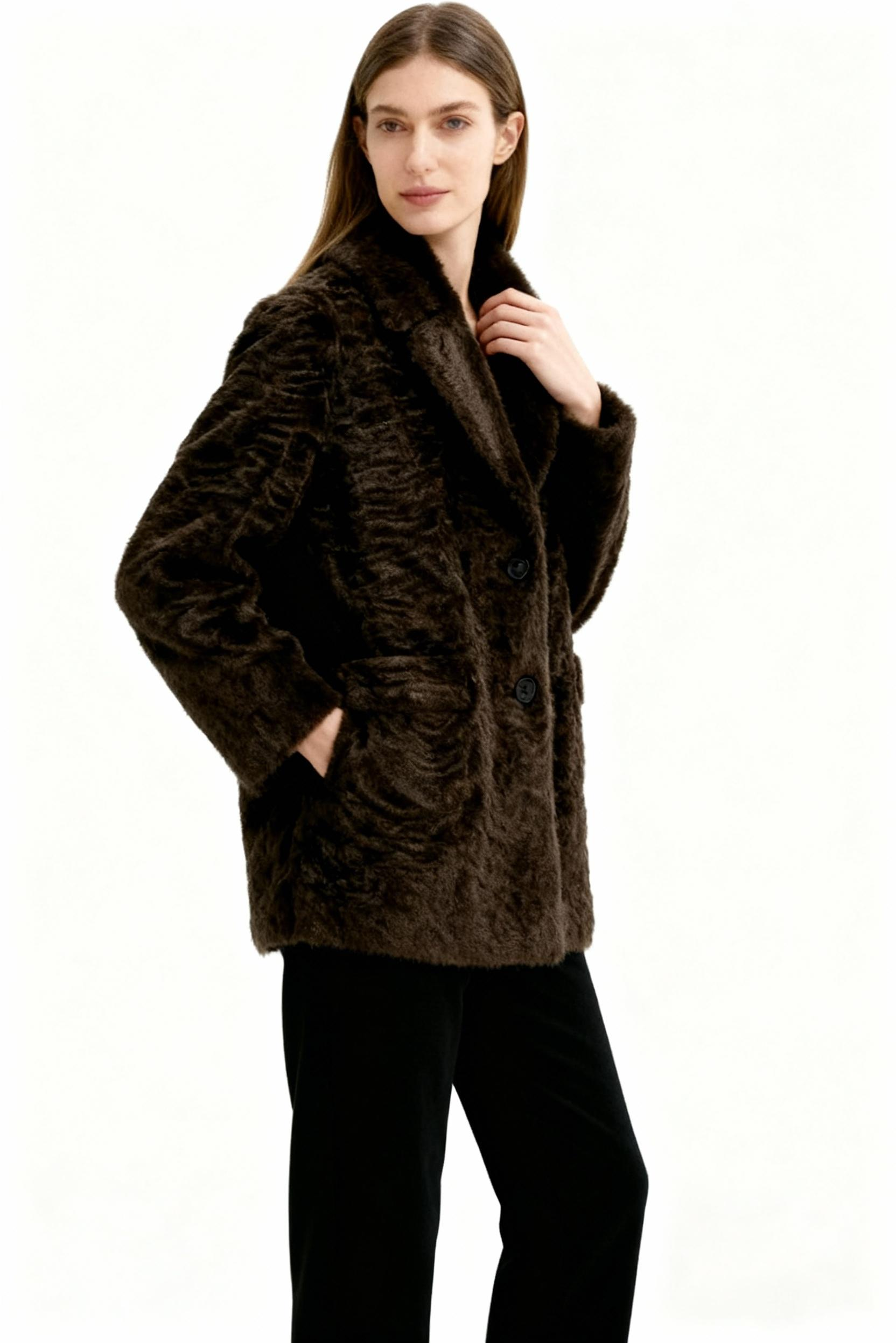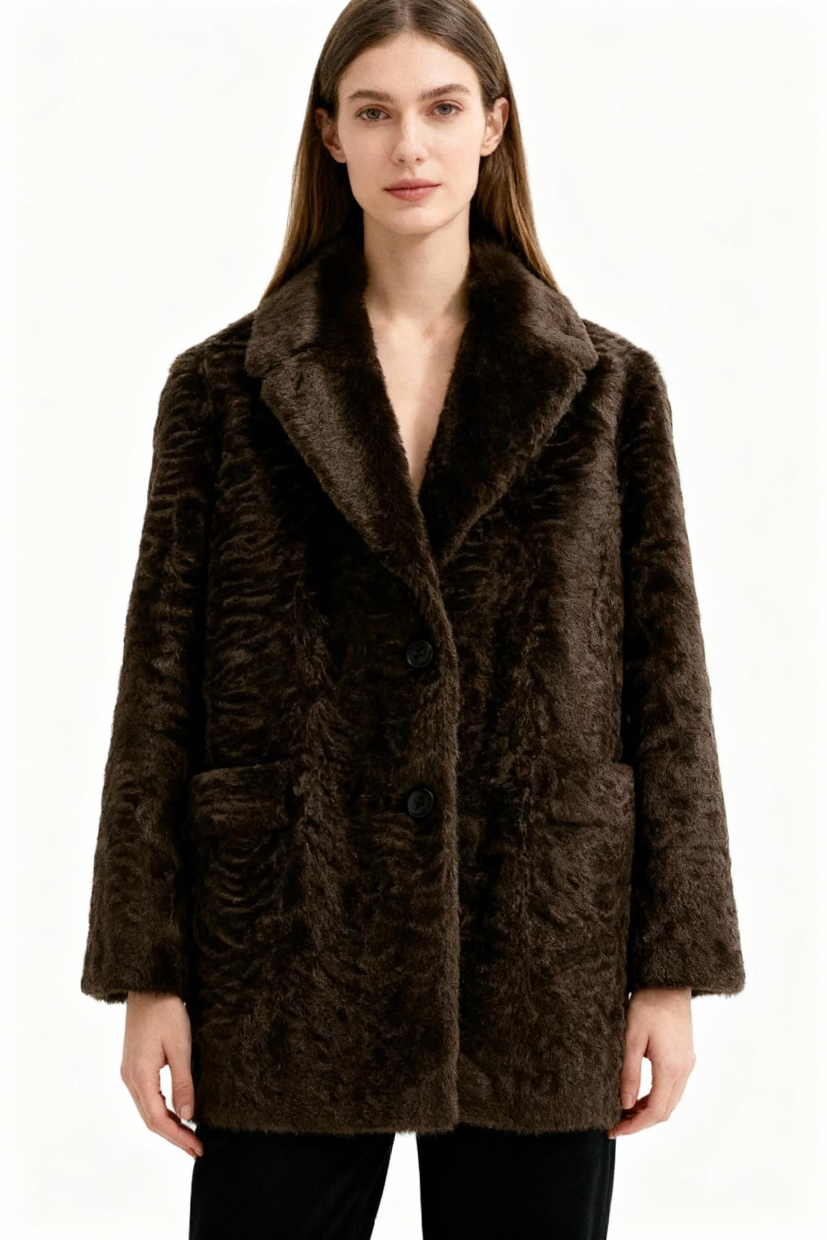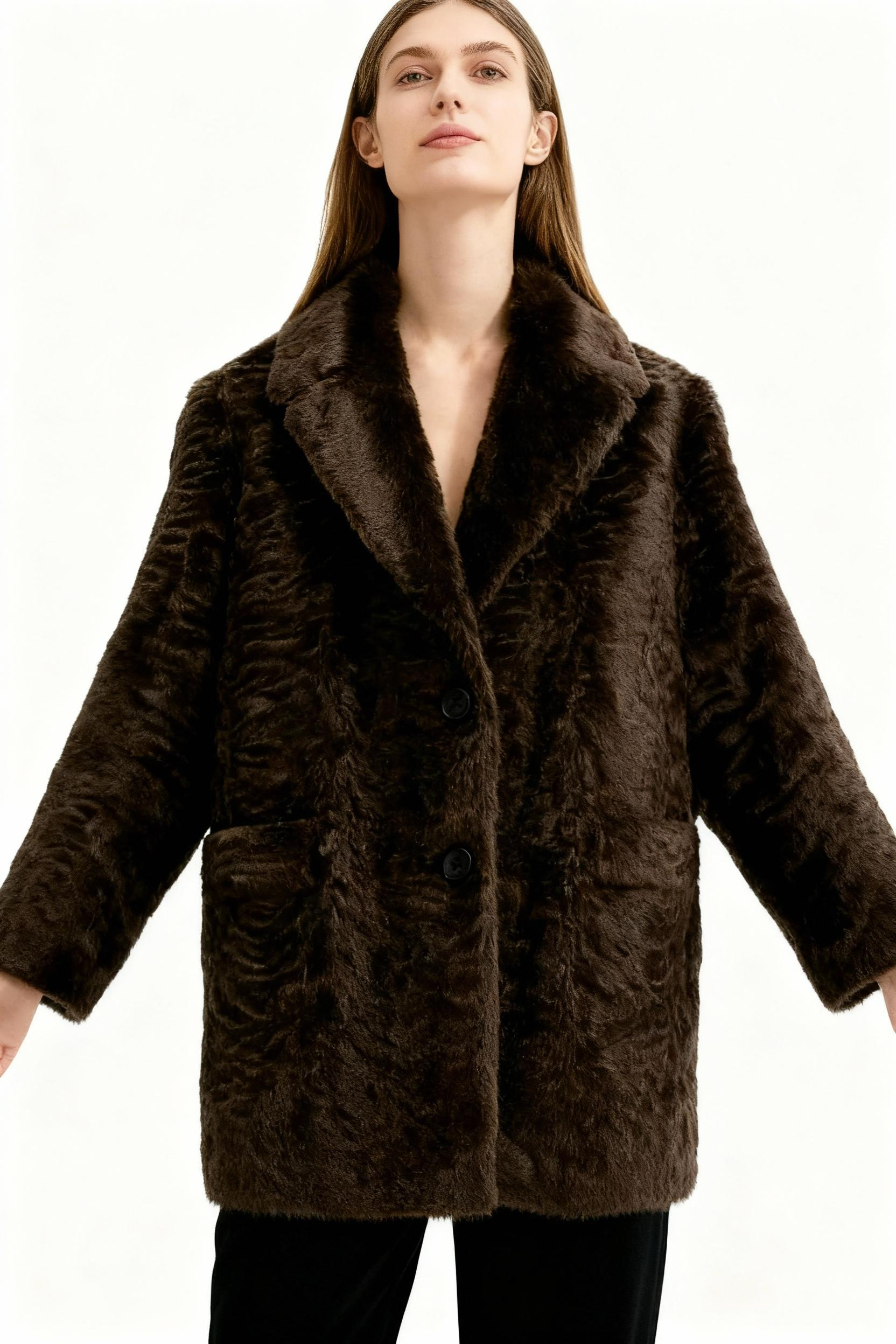 A sleek, straight-cut faux fur coat in a warm chocolate hue, featuring soft-textured faux pelts with subtle wave patterns that mimic premium natural fur. Designed for city wear, casual luxury, or boutique capsule collections, this coat is effortlessly versatile.