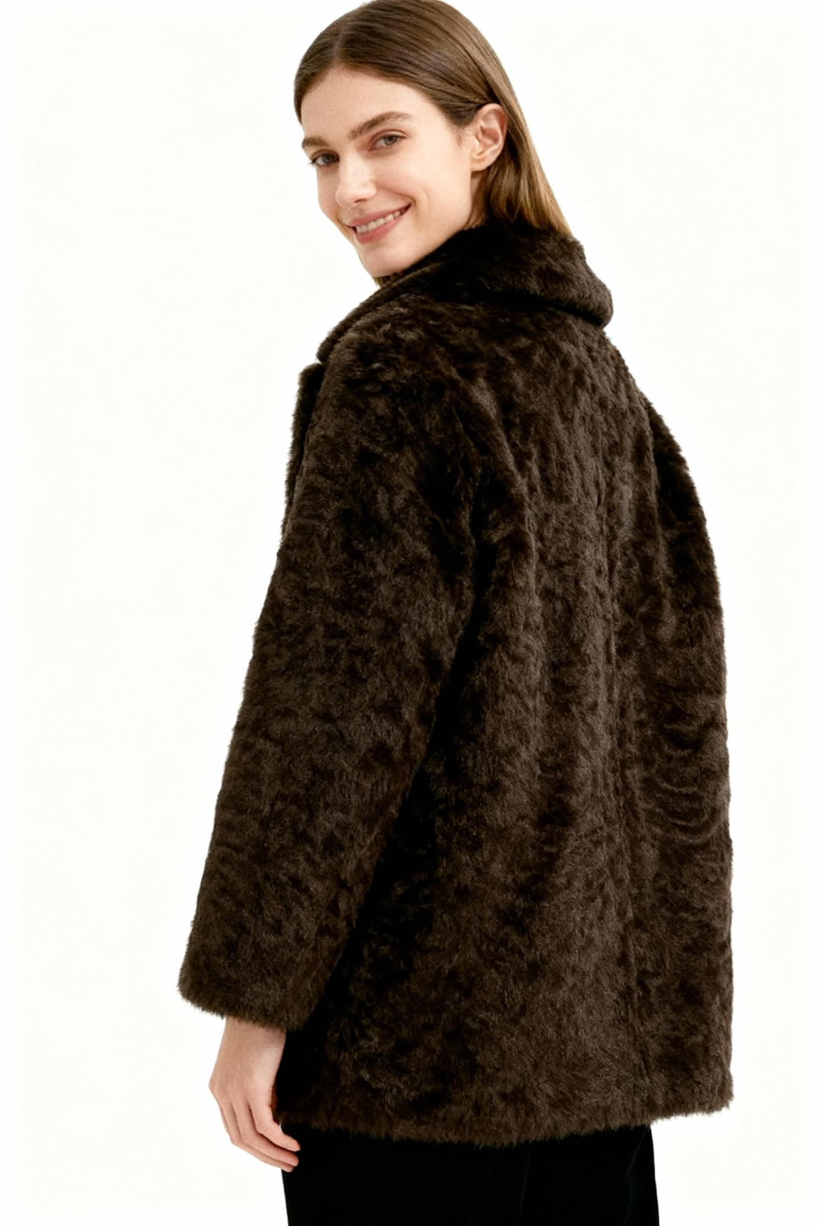 Timeless elegance meets modern ethics in this rich dark brown faux fur coat. Tailored for clean lines and urban refinement, it’s a staple for winter collections prioritizing both style and sustainability.