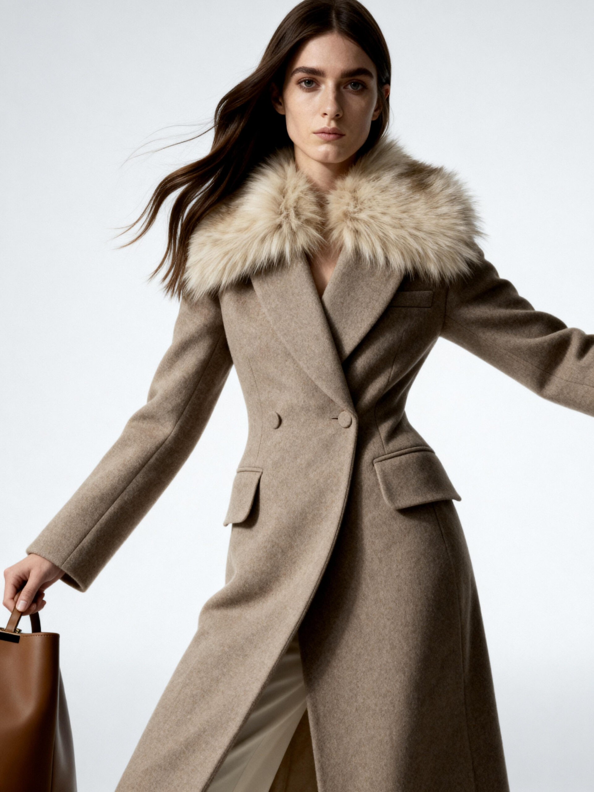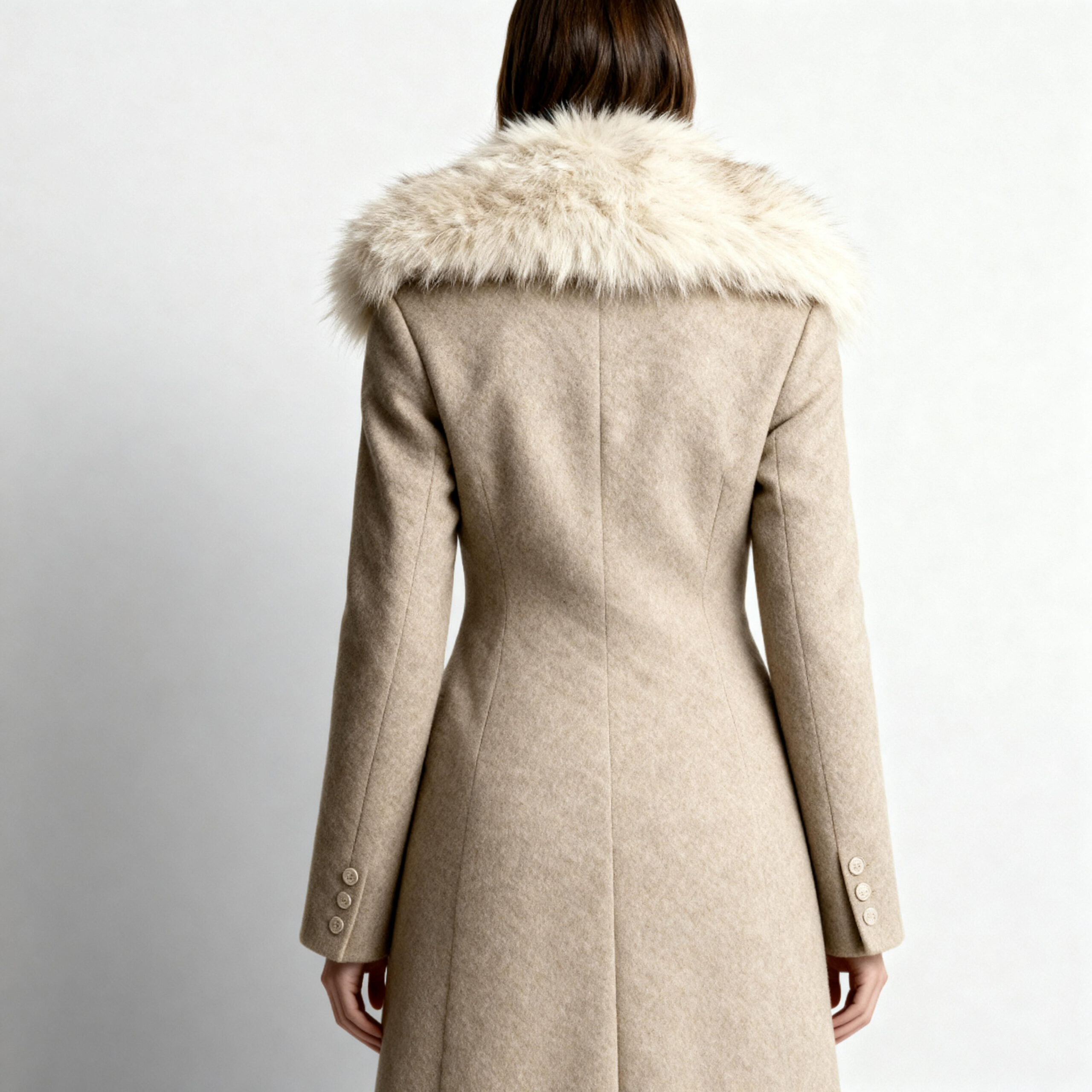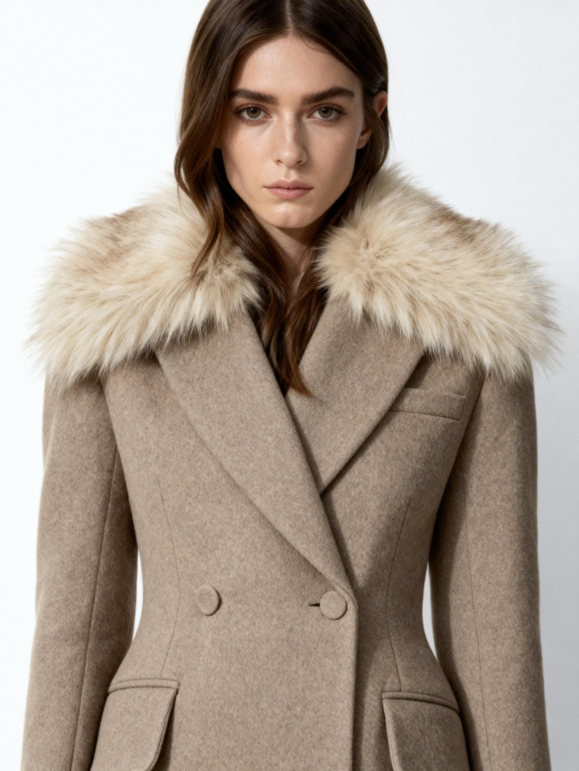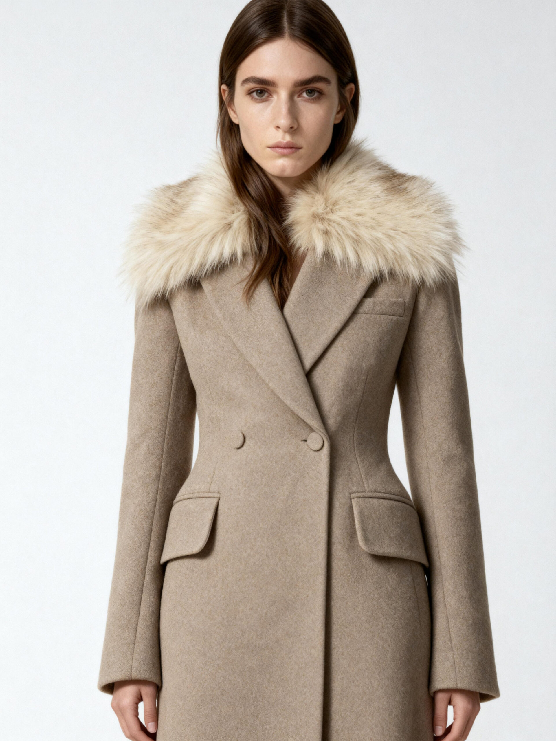 Material: Premium wool blend body with authentic fox fur collar — structured, warm, and luxurious.