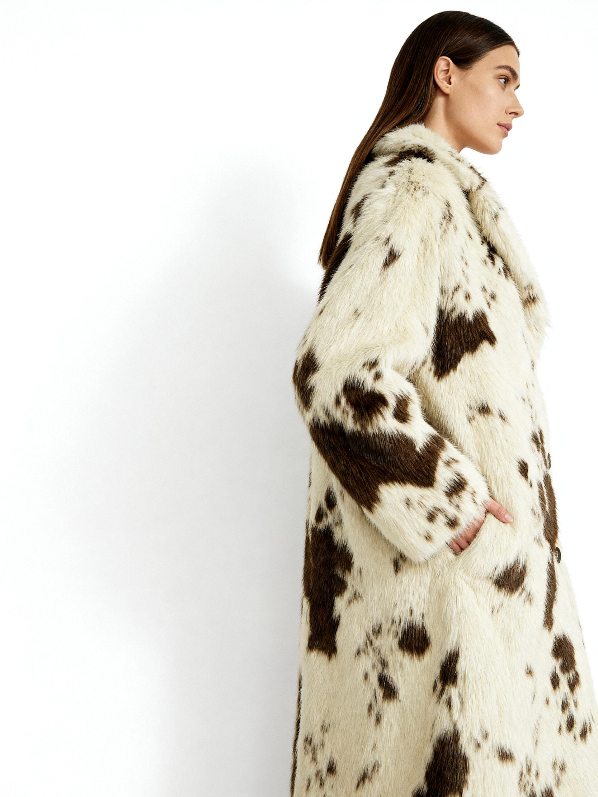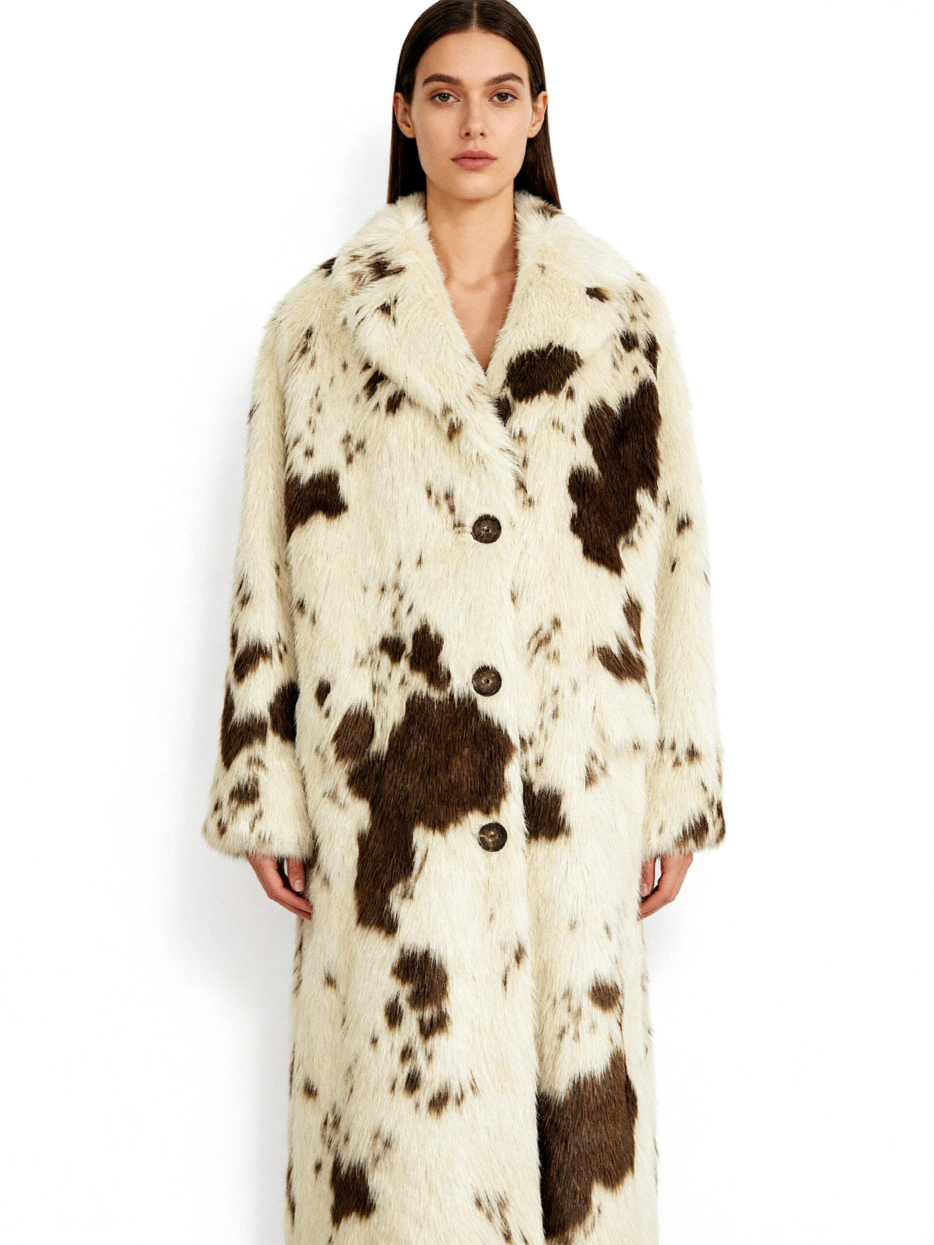 Command attention with this bold faux cowhide print long coat. Designed with a full-length silhouette and rich texture, this outerwear piece merges rural charm with high-fashion edge — cruelty-free and utterly captivating.