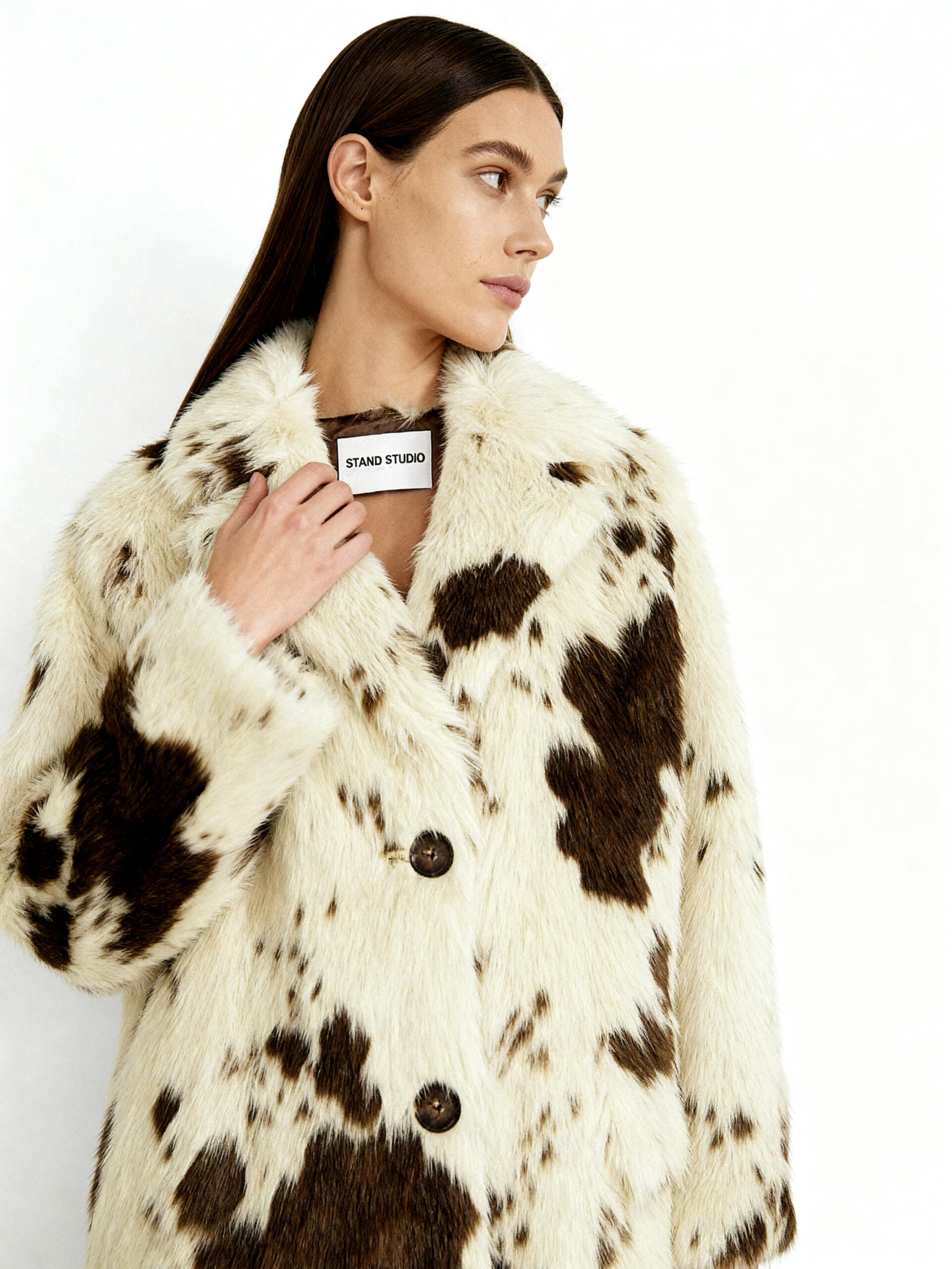 The fashion world is embracing Western and rural-inspired motifs, and this faux cowhide coat brings the trend to life without compromising ethics. Perfect for visual merchandising, social media campaigns, or editorial storytelling — it bridges bold style and conscientious values.