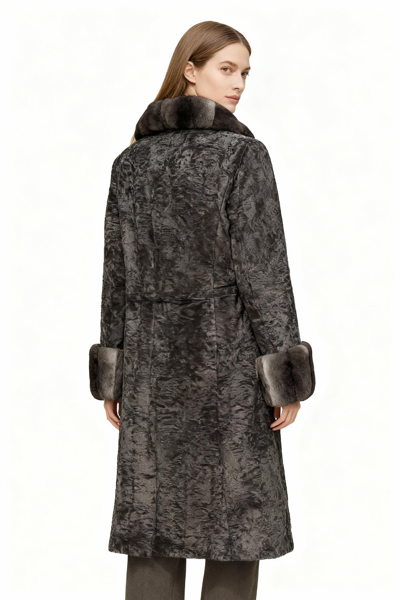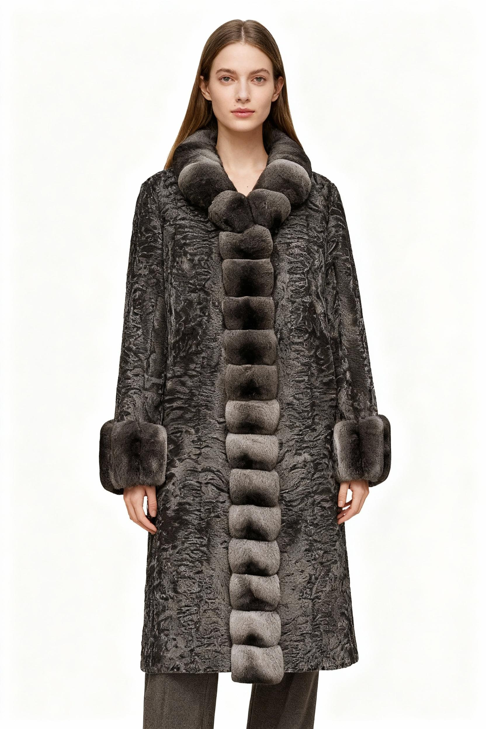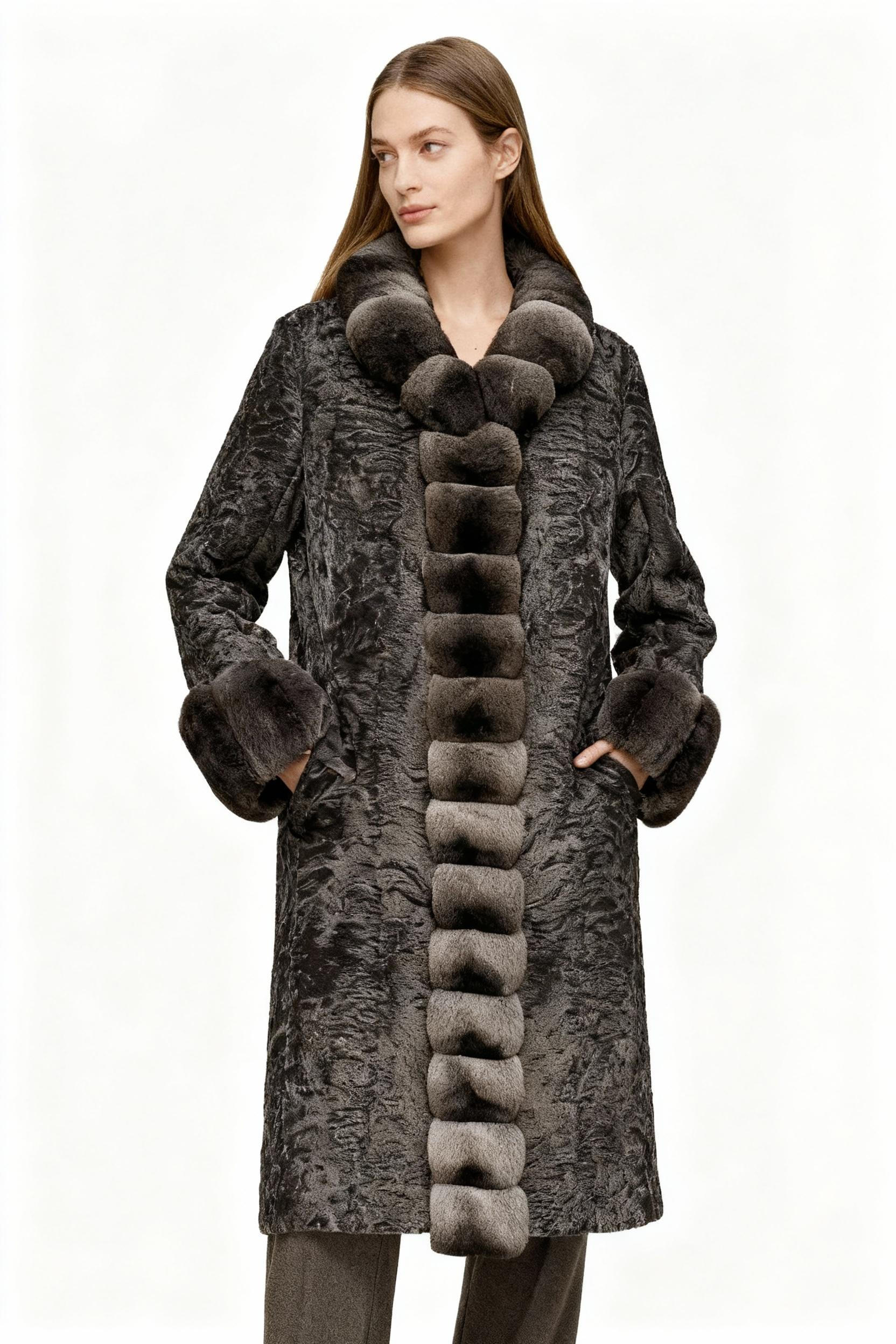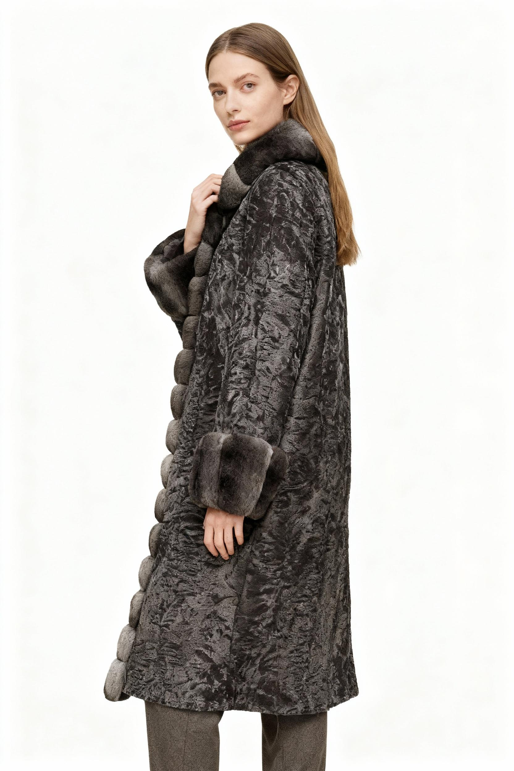 A rare fusion of innovation and classic luxury, this coat features a velvety crinkled faux fur base contrasted with pillowy bubble-shaped trim in lustrous grey faux chinchilla. Designed for clients who seek bold fashion statements that maintain classic silhouettes.