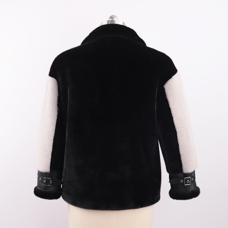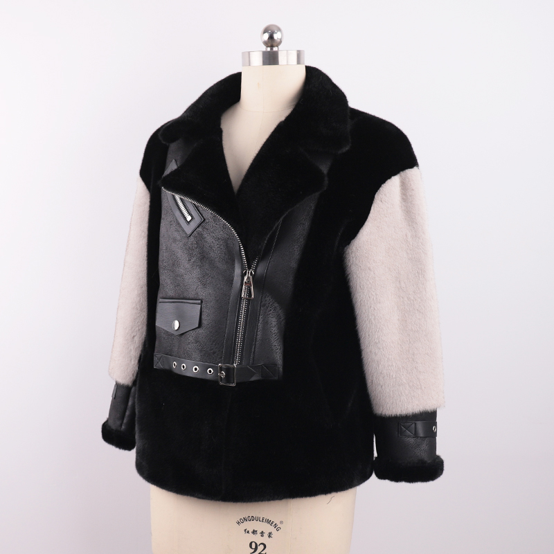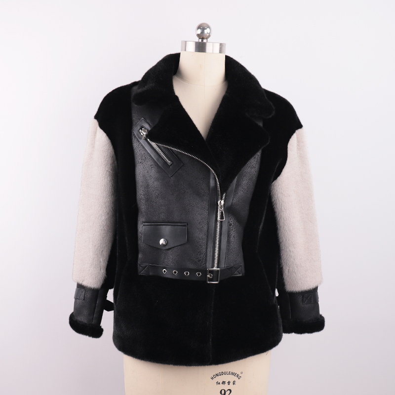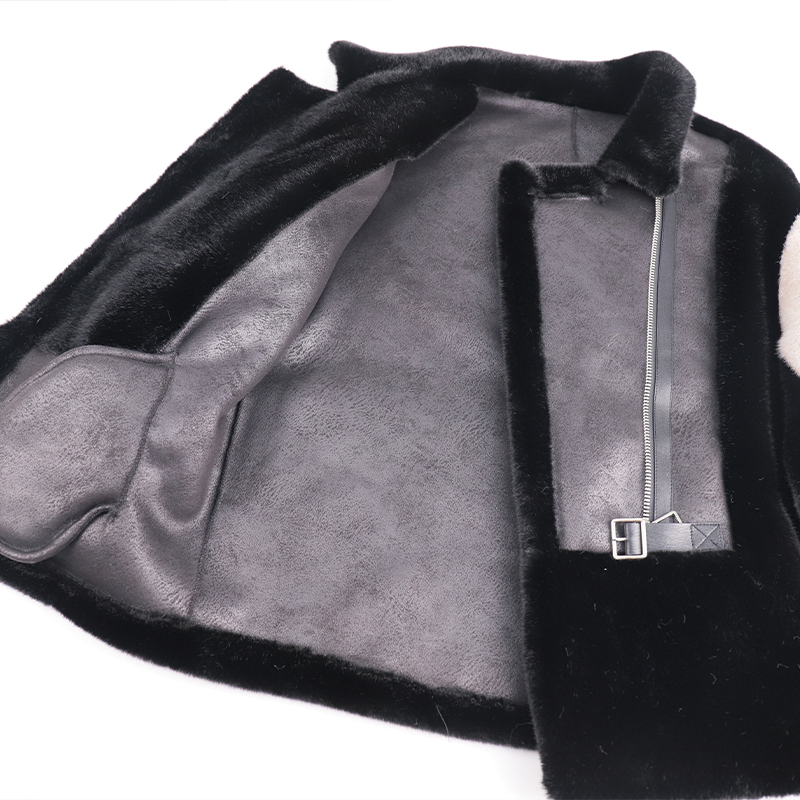 A daring blend of edgy moto design and luxe softness, this hybrid jacket fuses black faux fur, textured vegan leather, and contrasting wool-touch sleeves for a rebellious yet refined outerwear statement.