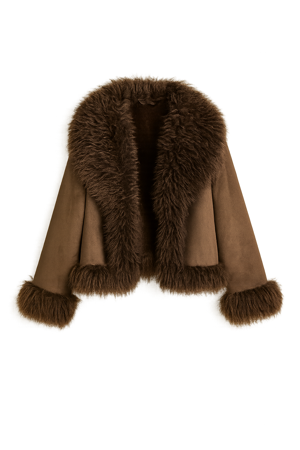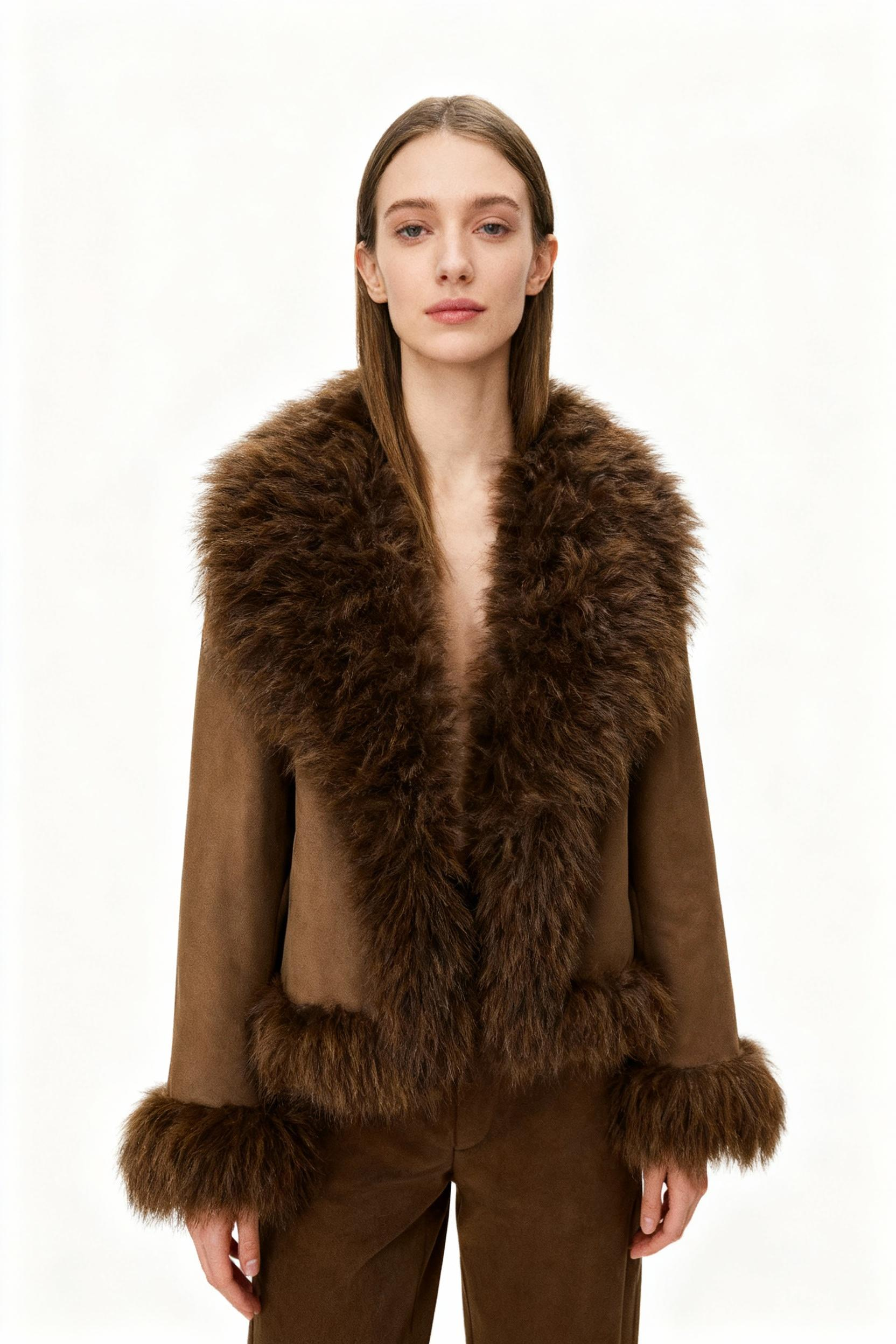 Crafted with precision and warmth in mind, this jacket offers a balance of soft structure and bold flair. The wide lapel, sleeve, and hemline trims use ultra-fluffy faux fur that mimics Toscana shearling, while the matte suede fabric maintains a clean silhouette.