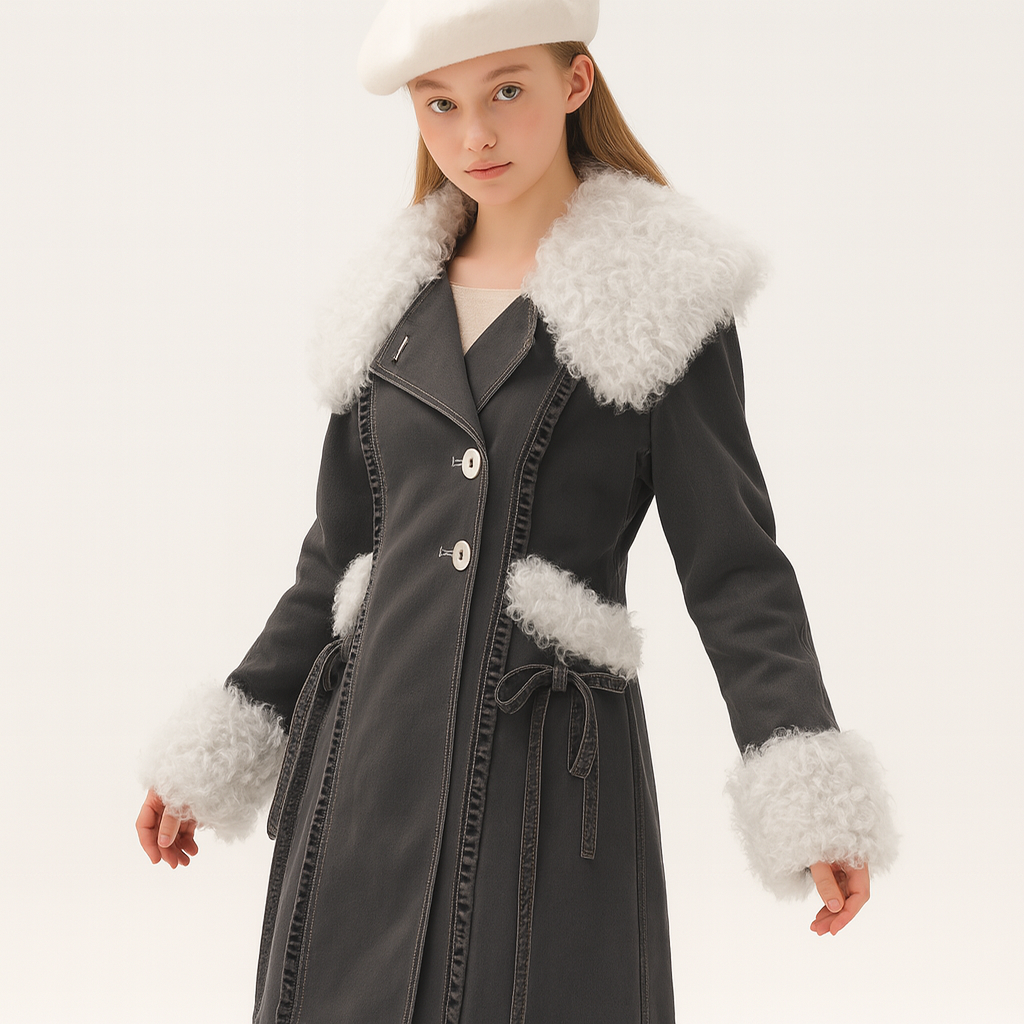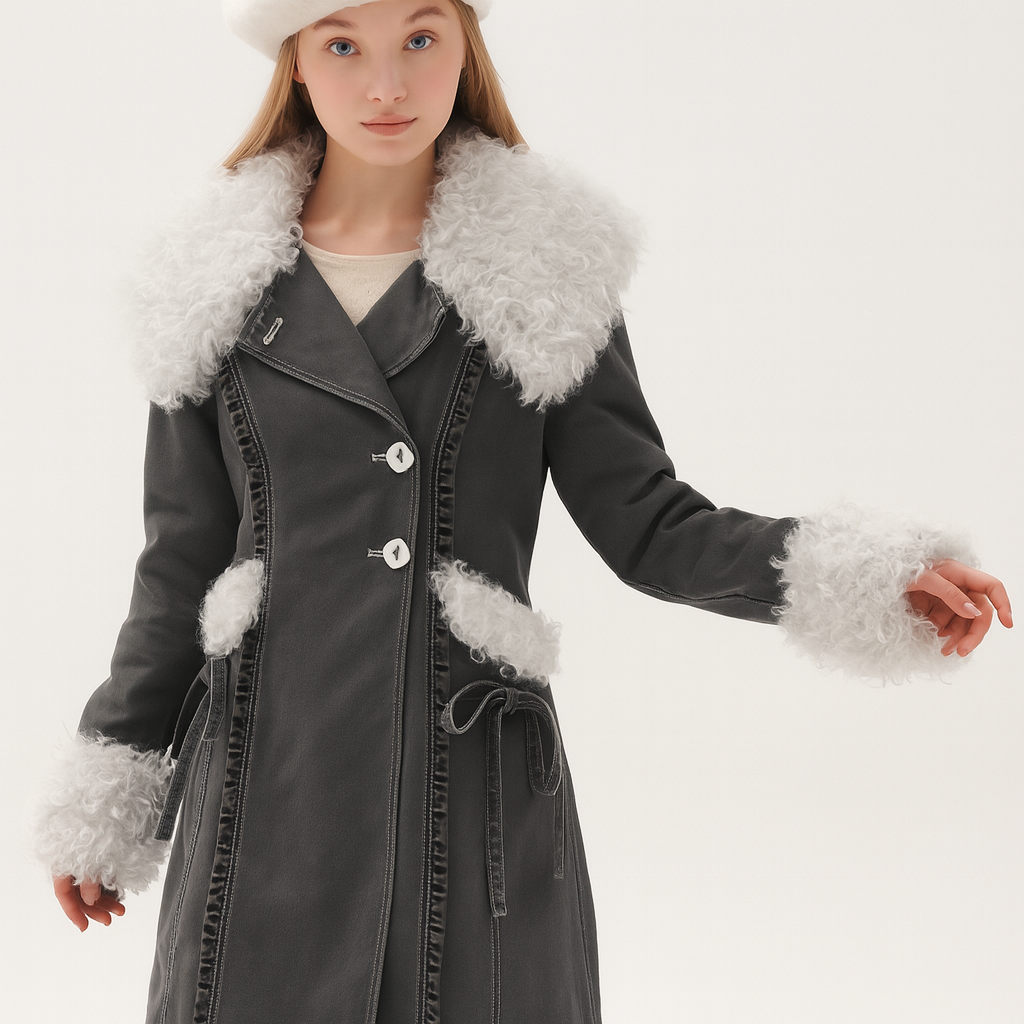 This coat offers a dramatic, editorial-friendly silhouette that blends classic trench formality with playful winter coziness. Its faux shearling elements echo retro ski-lodge aesthetics while the sleek faux leather keeps it modern and cruelty-free. Ideal for brands appealing to Gen Z, vintage revival lovers, and content creators.