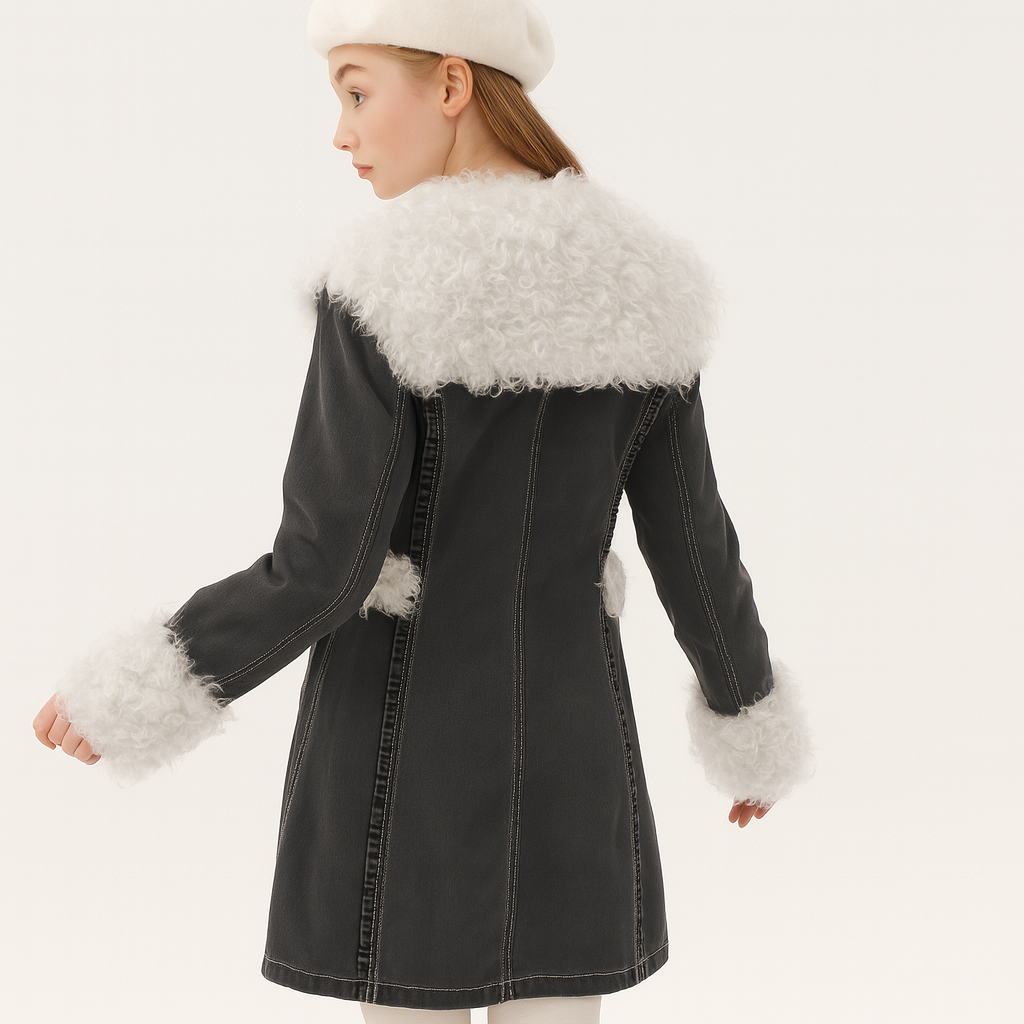 ☁️ Curly White Faux Fur Trim – High-pile collar, cuffs, and pockets for visual texture