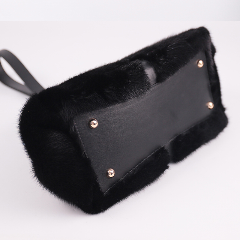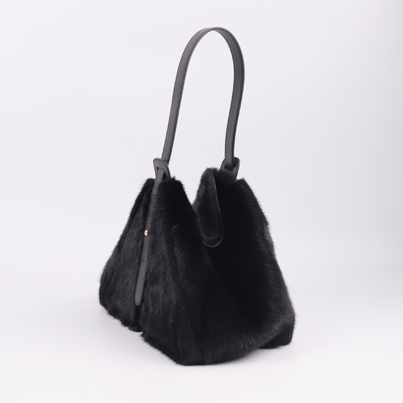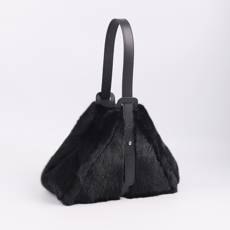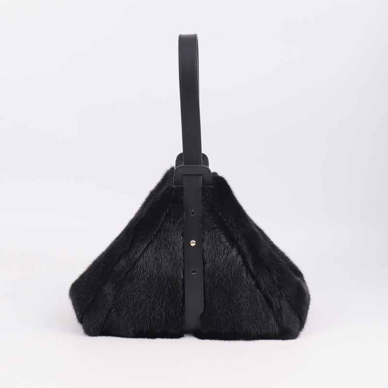 This premium triangular handbag combines ultra-soft genuine mink fur with smooth black leather in a bold, architectural wristlet design. The ultimate fusion of couture craftsmanship and winter glam.