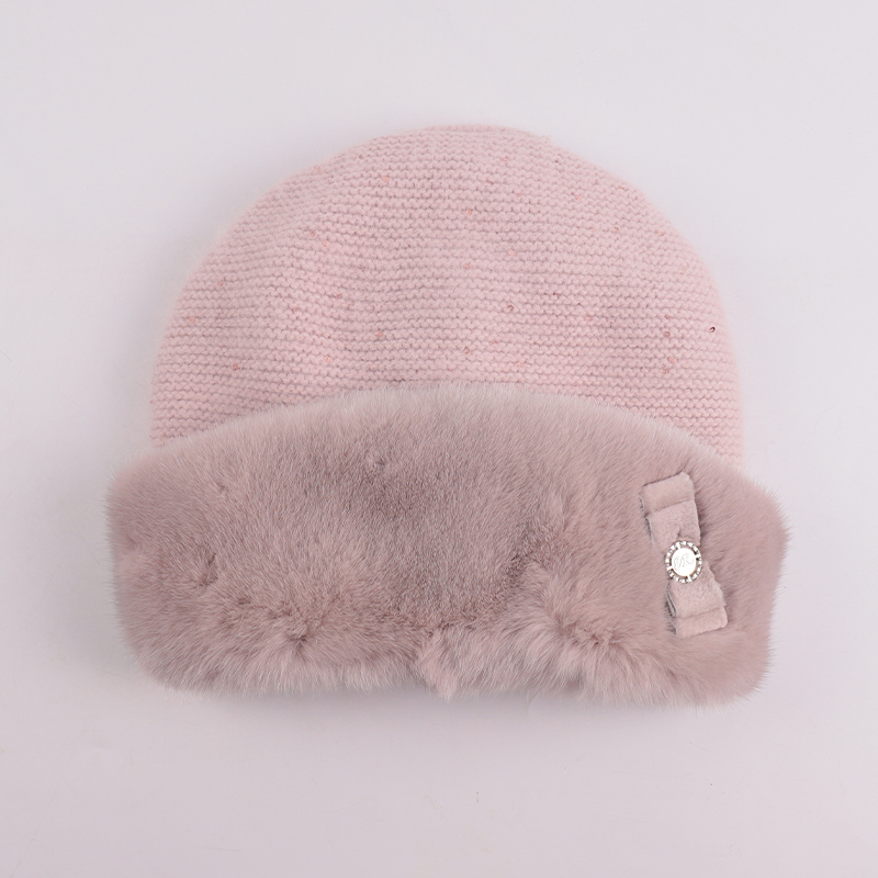 Crafted with a soft and insulating angora blend, this knit hat is designed for those who appreciate elegance in every detail. The full brim is encased in dense, plush genuine mink fur, providing unparalleled warmth and a high-fashion finish. Subtle sequin accents are woven into the knit, while a structured bow and jeweled embellishment at the back elevate the feminine charm.