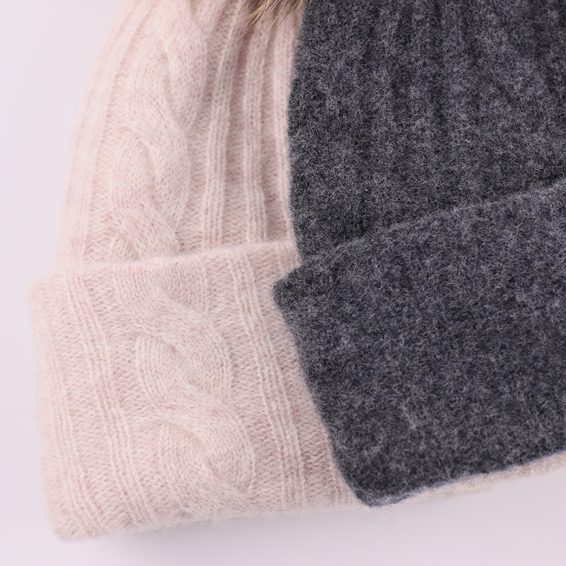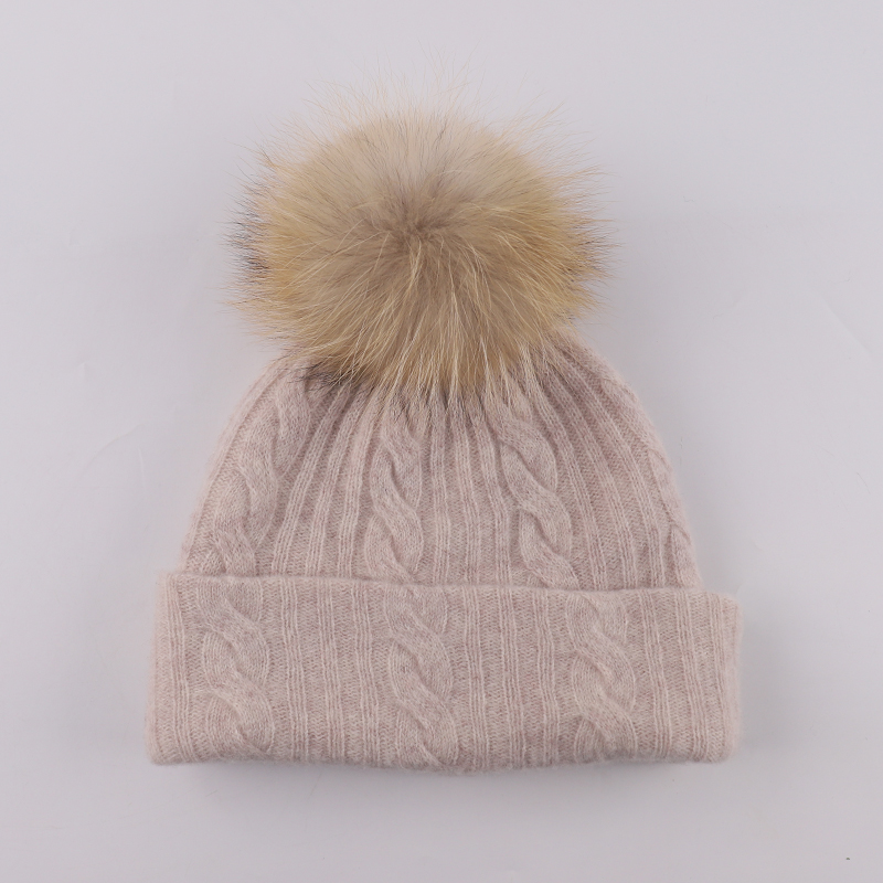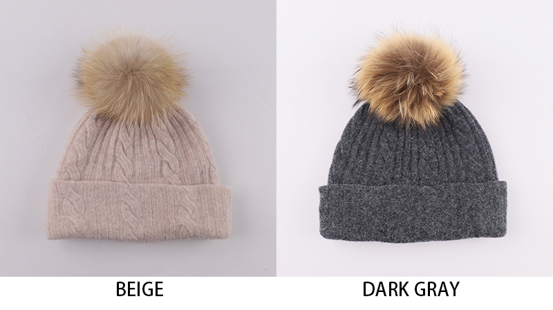 This cable-knit wool hat is a blend of timeless design and premium materials. The thick knitted body ensures excellent warmth and breathability, while the genuine raccoon fur pompom adds an element of natural luxury. Available in neutral tones such as beige and dark gray, it’s the perfect accessory for retailers offering high-quality winterwear that balances comfort and sophistication.