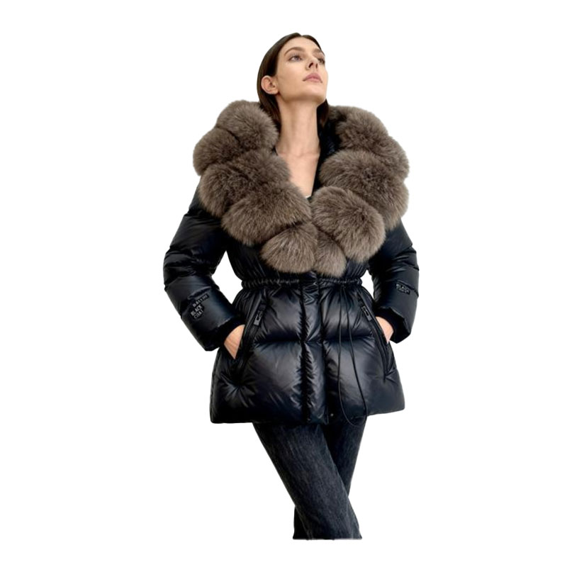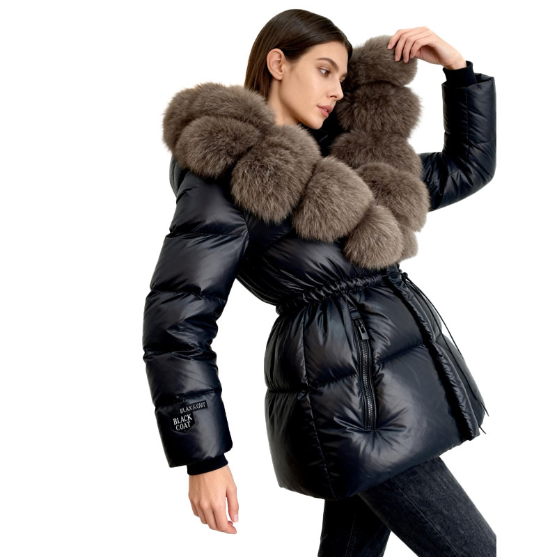 This sculptural silhouette features a lustrous black shell padded with ultra-warm down fill, cinched at the waist for a flattering profile. The star detail: a voluminous, rich mocha-colored fox fur collar, dramatically framing the neckline. Ideal for retail displays, editorials, and e-commerce collections that call for drama, warmth, and luxury.