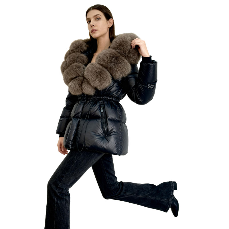Strikingly luxurious and modern, this belted down jacket combines high-gloss nylon with an exaggerated natural fox fur collar. A must-have showpiece for upscale winter edits and high-fashion retailers.