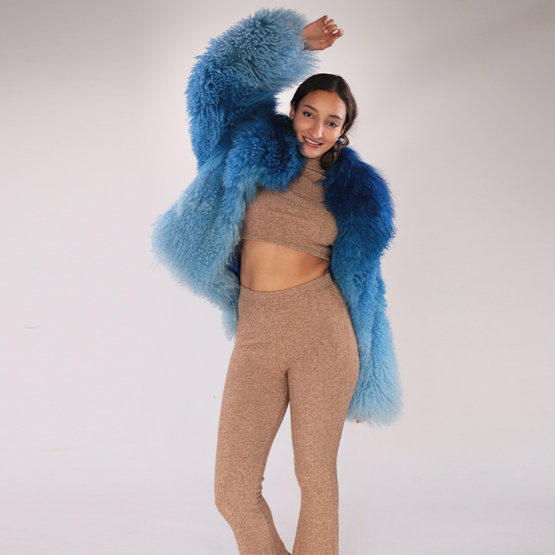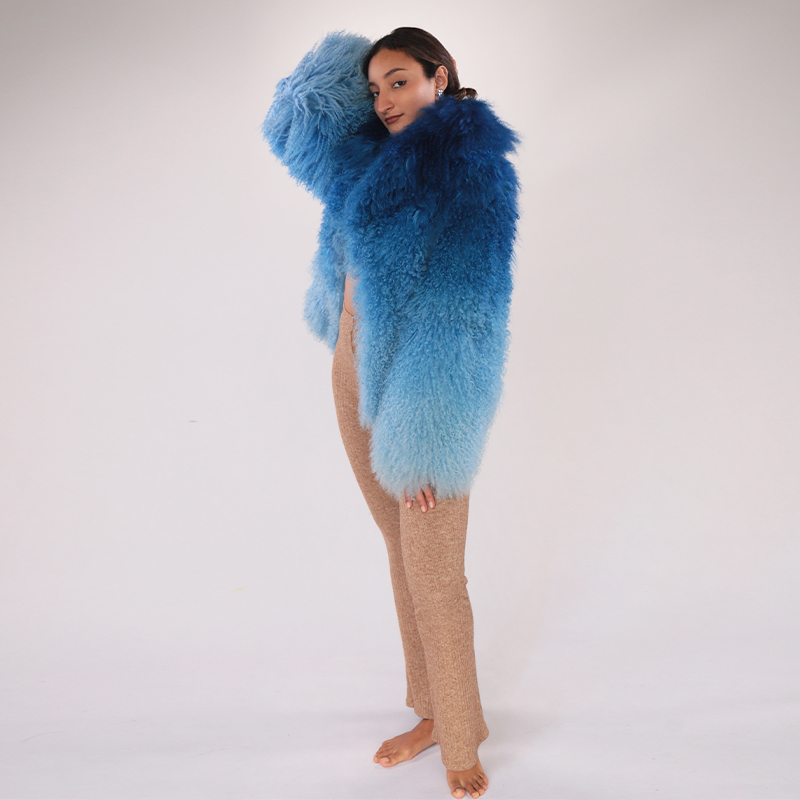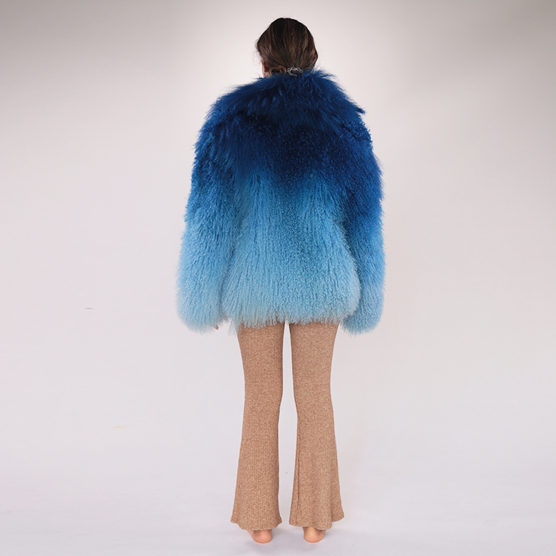 Stay warm and stand out with this Mid-Length Gradient Beach Wool Coat, crafted from real beach lamb shearling and hand-dyed into rich blue gradients. This luxurious outerwear piece merges color artistry with high fashion, perfect for trendsetters and winter collections alike.