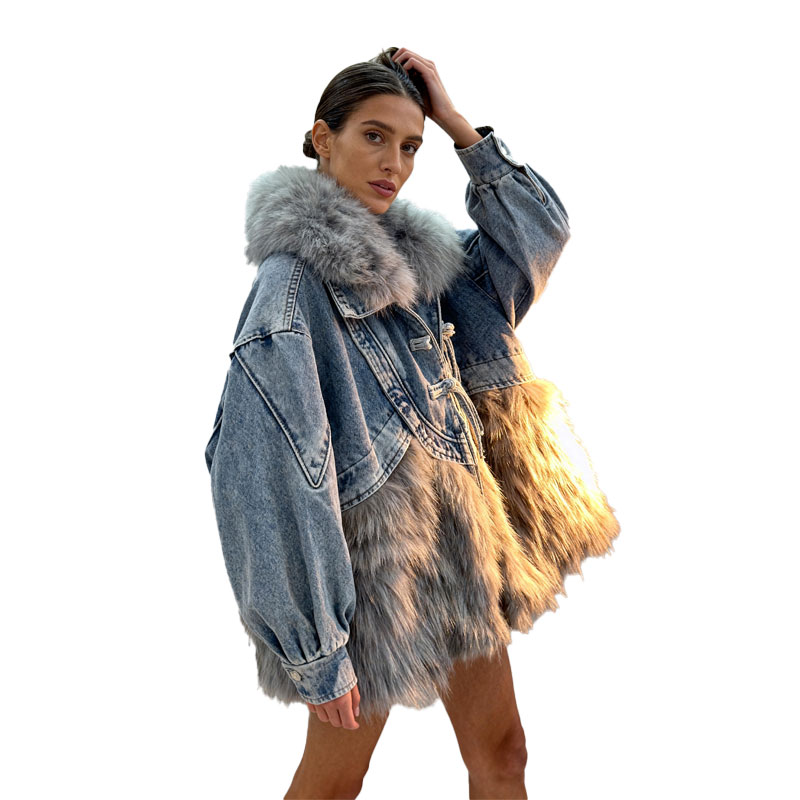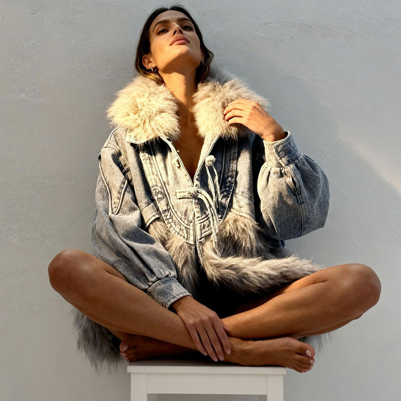 This avant-garde parka merges the rugged, urban texture of washed blue denim with luxuriously thick silver-grey faux fur. The oversized silhouette, exaggerated drawstring neckline, and drop-shoulder sleeves deliver both comfort and high fashion drama. An ideal hero piece for fashion-forward retailers and stylists looking to inject volume and texture into their outerwear lineups.
