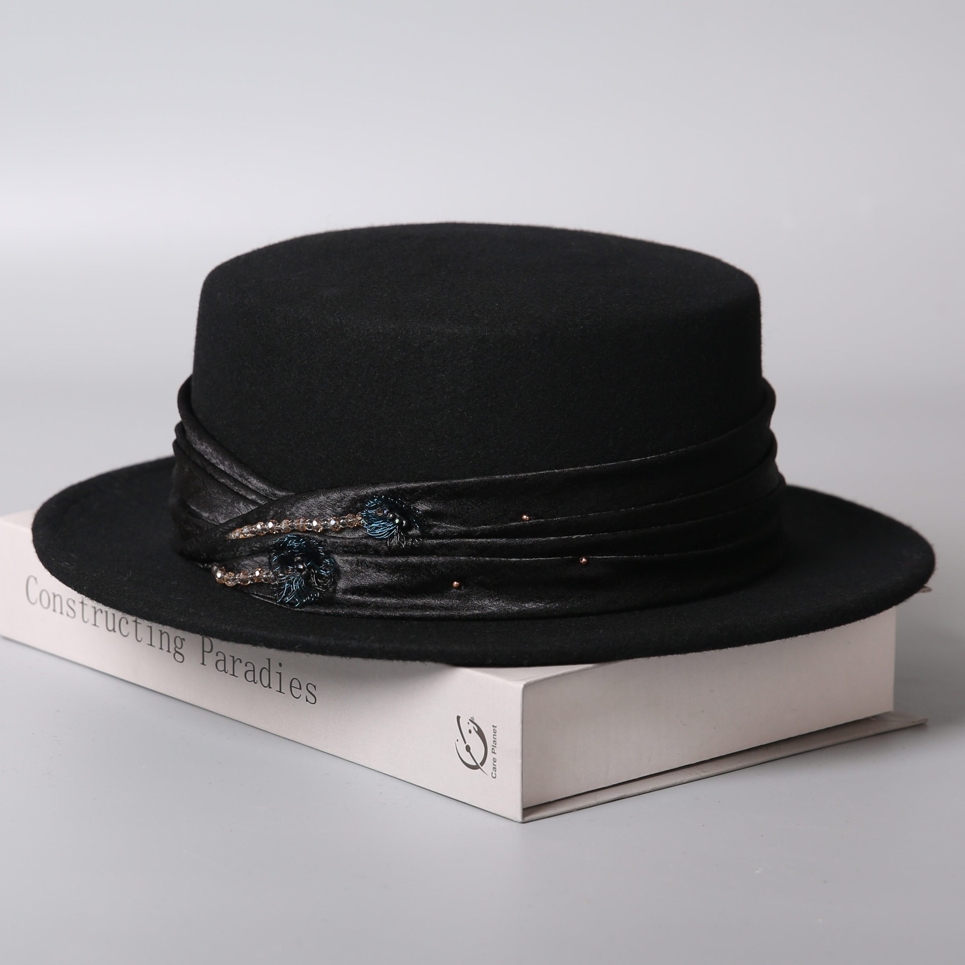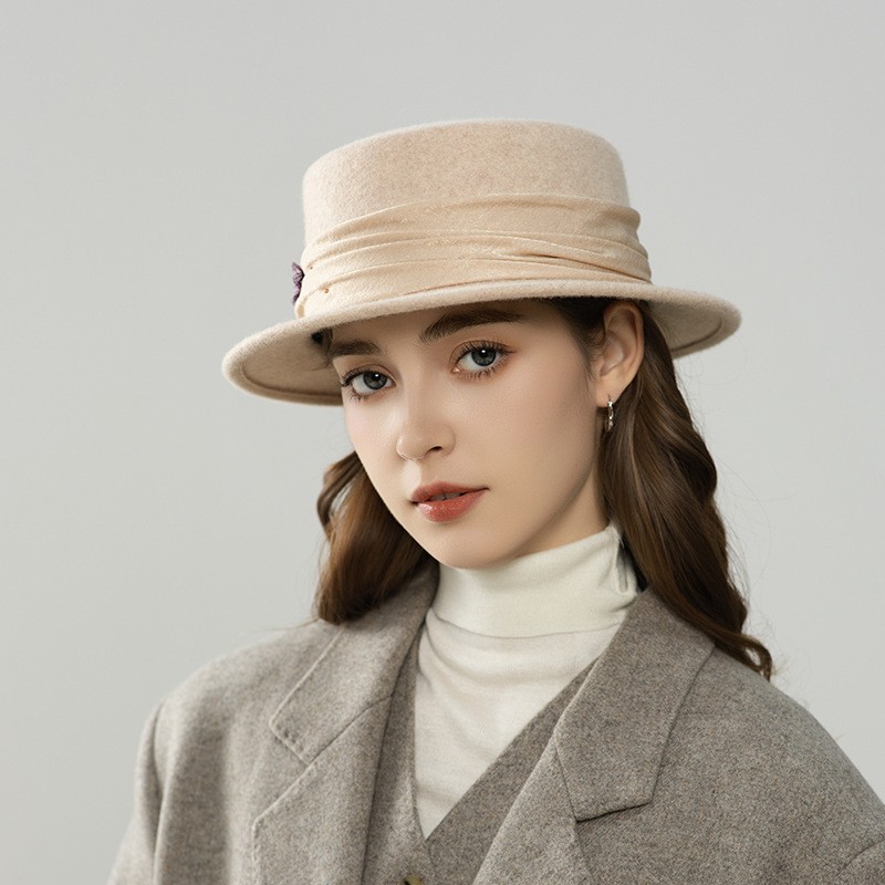 Timeless elegance meets vintage sophistication in this Hepburn-style structured wool felt hat. Defined by its flat crown and firm brim, this design features a ruched velvet band accented with botanical brooch pins, ideal for refined winter and resort accessories collections.