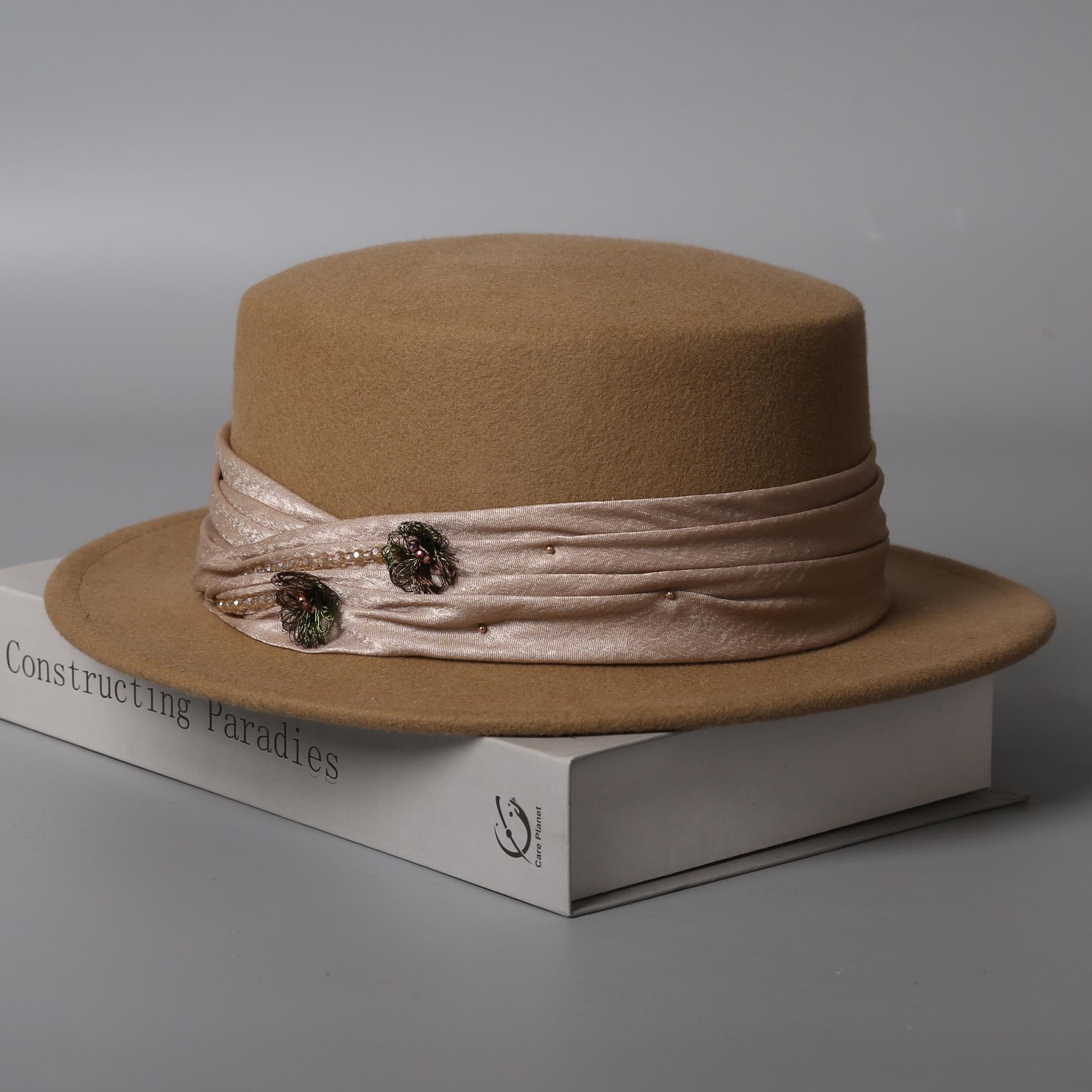 Crafted from 100% wool felt, this mid-brim hat channels the grace of Old Hollywood icons. The rich camel hue is offset by a champagne velvet sash delicately pinned with jeweled embellishments. Ideal for retailers targeting vintage-inspired, formalwear, and luxury accessory markets.