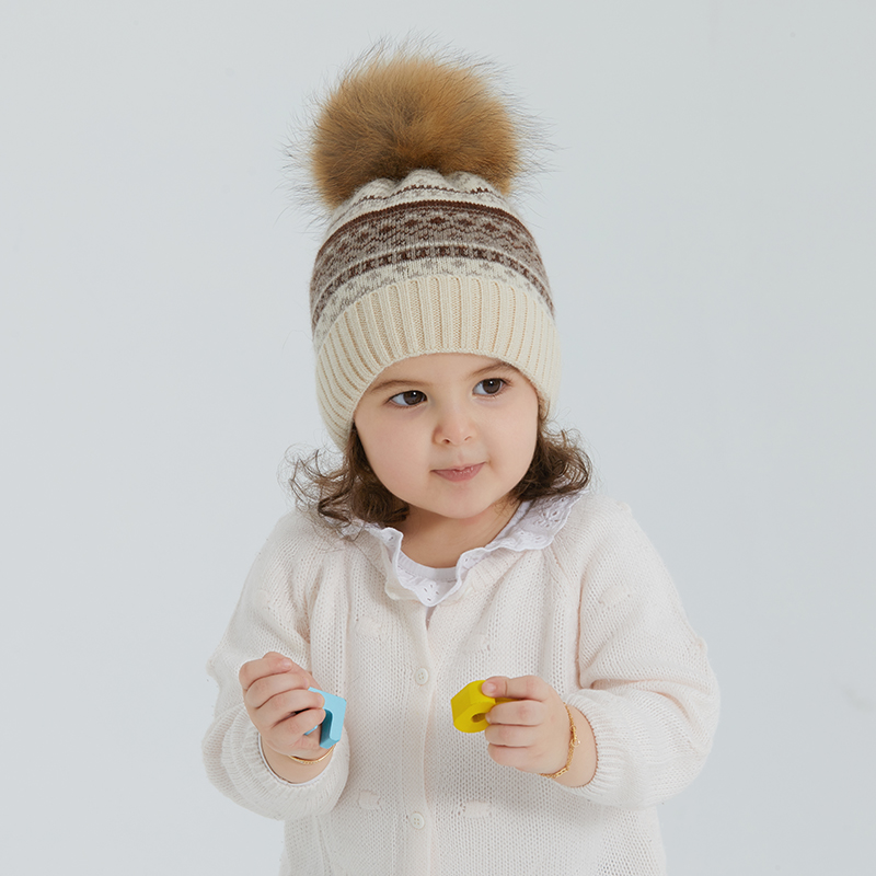 This beautifully detailed winter hat for children blends classic Scandinavian design with upscale materials. The thick angora-blend knit offers superior insulation, while the plush raccoon fur pom on top adds a luxurious, playful touch. Whether worn in snowy parks or chilly school mornings, this beanie keeps kids both warm and picture-perfect.