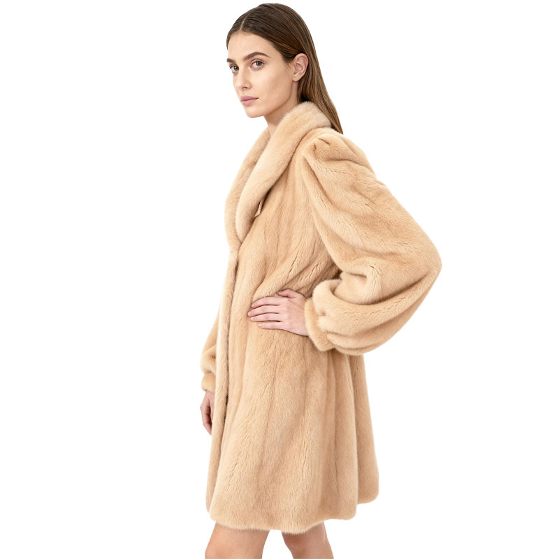 This luxurious light beige mink fur coat features a straight cut with a softly tailored shoulder and gentle gathers at the sleeves. The coat’s natural luster and fine texture highlight the premium quality of mink, making it a staple for high-end winter wardrobes. A minimalist design ensures timeless elegance and versatility, ideal for both daywear and formal evenings.