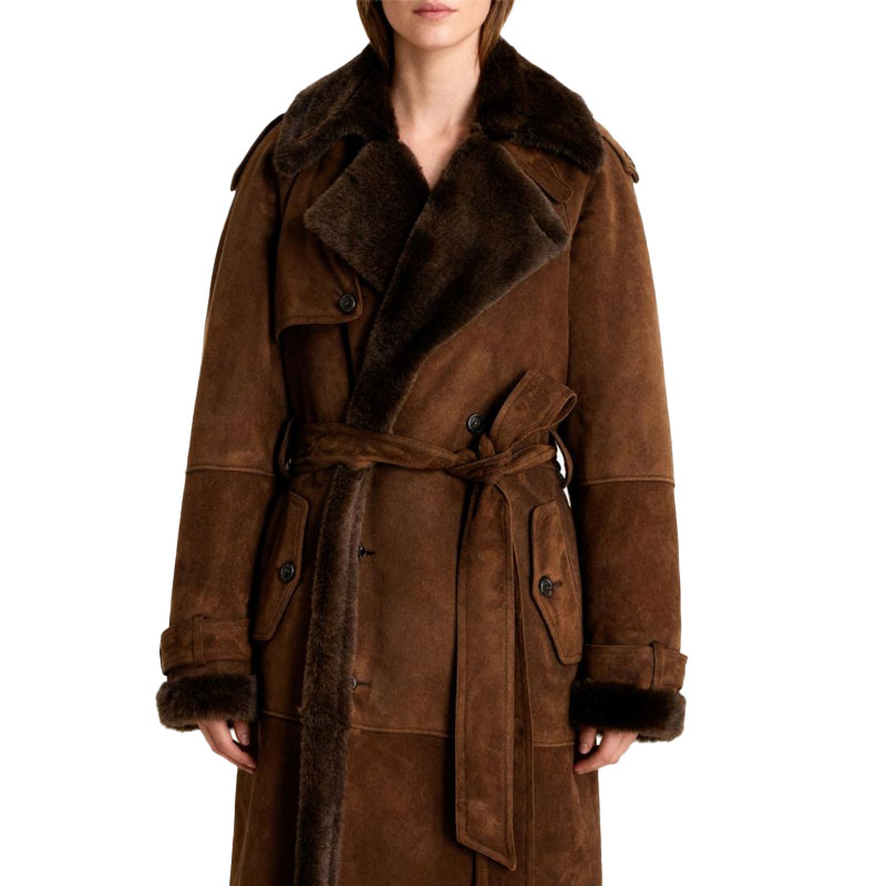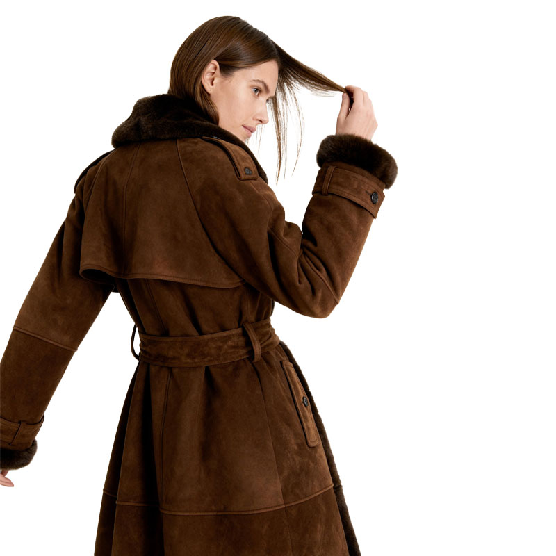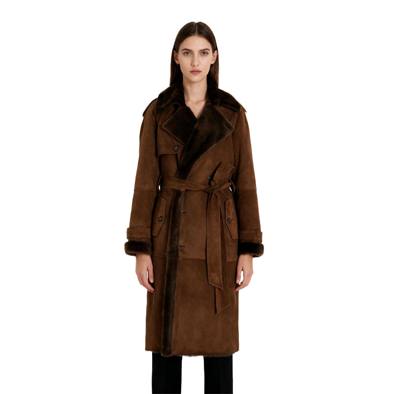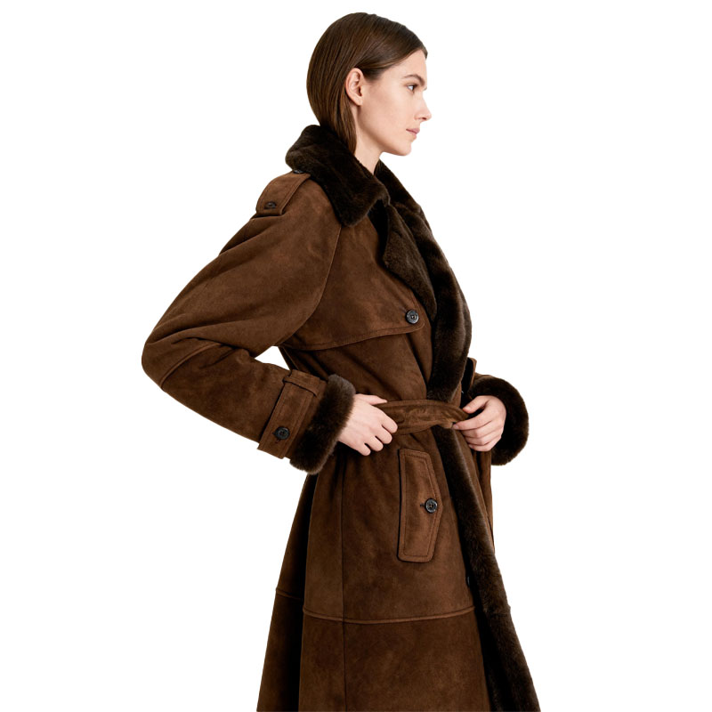 This double-breasted long coat features genuine sheepskin with a suede exterior and plush shearling lining. The belted waist, lapel collar, and tailored finish create an elegant yet cozy profile ideal for cold climates and luxury markets.