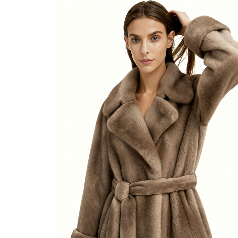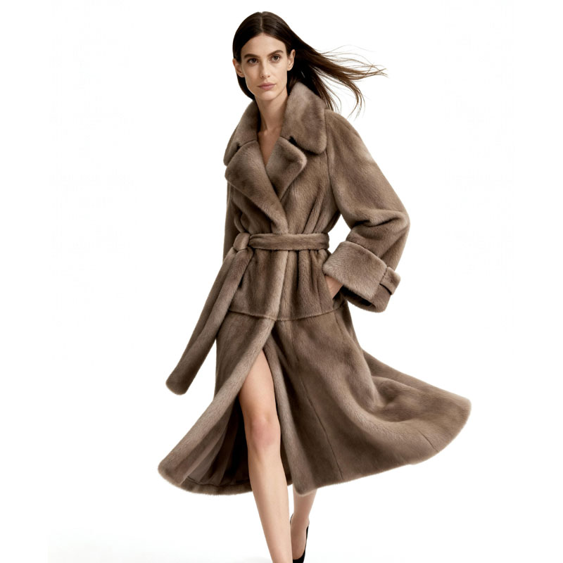 This full-length mink coat exudes luxury from every angle. Designed with a classic notched lapel and a waist-defining belt, it wraps the body in velvety fur that radiates understated glamour. The natural sheen of the real mink enhances its plush texture, making it a favored choice for discerning women and luxury fashion buyers.
