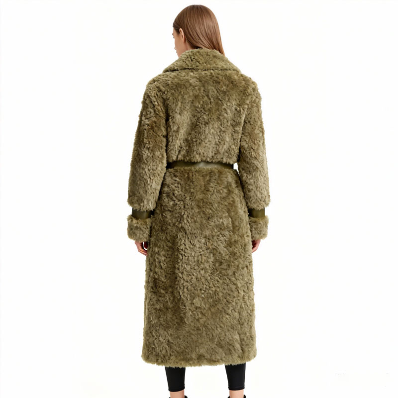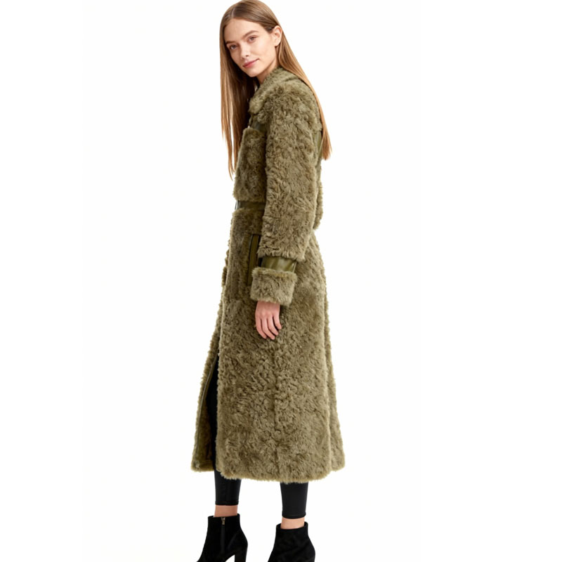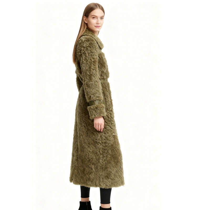 A full-length winter statement crafted from genuine lamb shearling in a muted olive tone. Featuring distinct panel construction and luxurious plush texture, this coat blends utilitarian warmth with high-end editorial appeal.