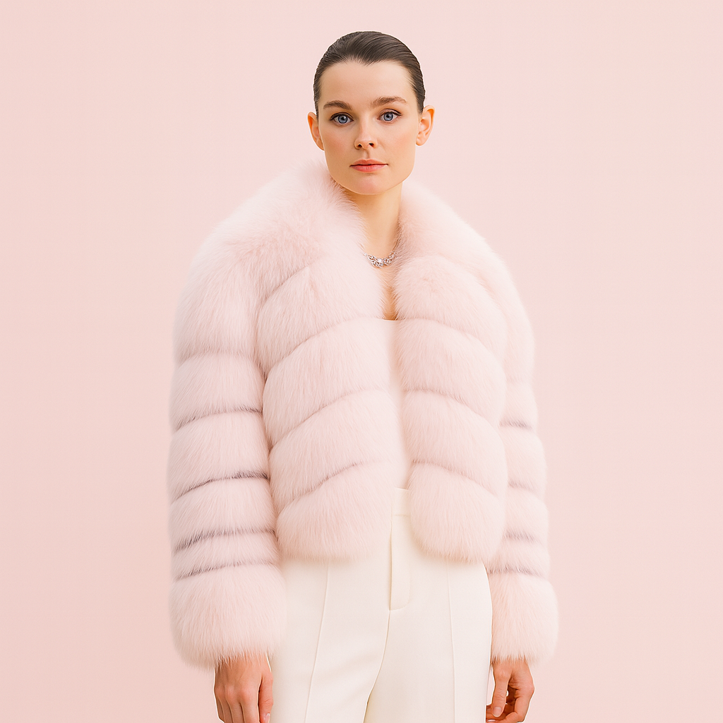 Luxury pink cropped fur jacket for women – ultra-soft, plush design with voluminous panels, perfect for winter elegance, events, or fashion-forward streetwear. Limited edition.