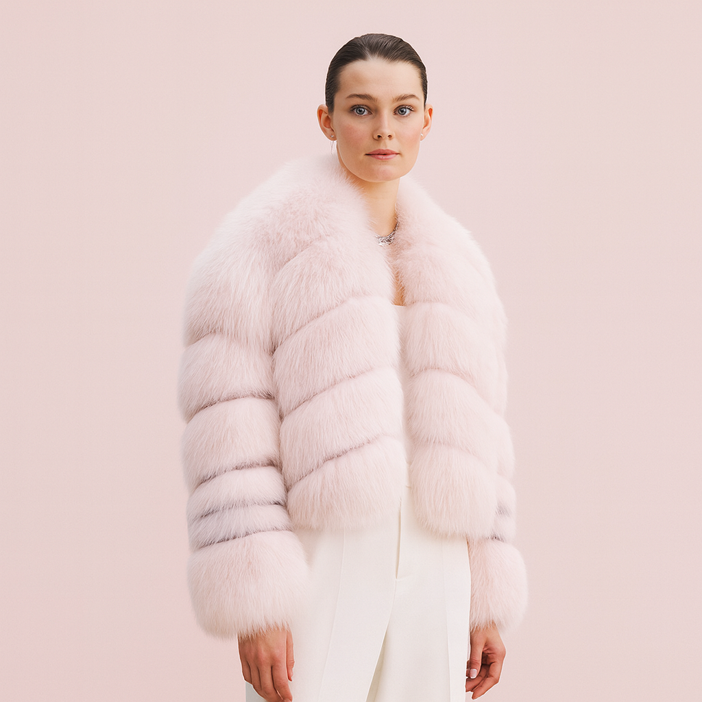 The Luxury Pink Cropped Fox Fur Jacket is crafted for wholesalers, fashion brands, and designer labels seeking luxury winter outerwear with high production consistency.
