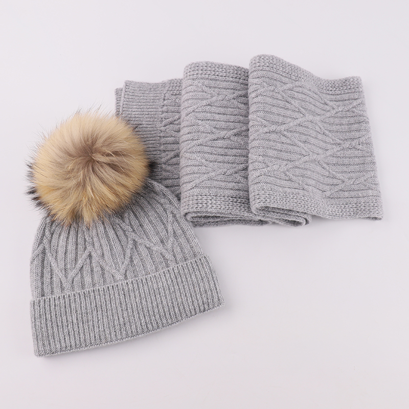 A premium two-piece winter set that pairs a thick cable-knit hat with a detachable genuine raccoon fur pompom and a matching oversized scarf. Crafted from soft angora-blend yarn, this set delivers warmth, texture, and effortless style – ideal for boutique retail and high-end winter accessory lines.