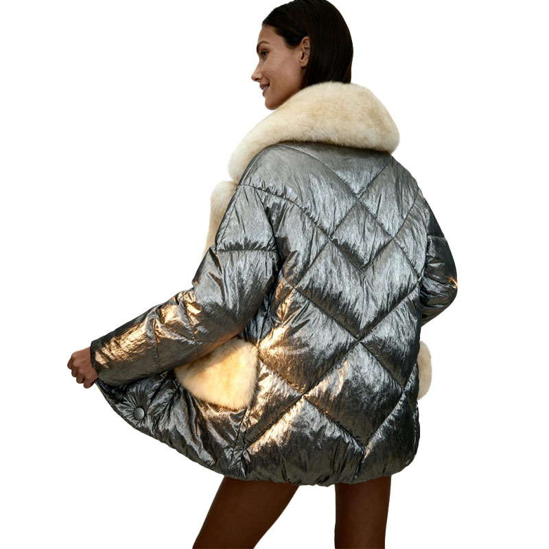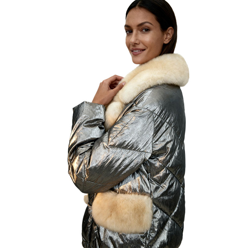 This statement-making down jacket combines futuristic fashion with luxury warmth. Crafted in a high-shine metallic silver shell and finished with plush cream fox fur trim, it’s designed for show-stopping outerwear collections targeting bold, style-forward audiences.