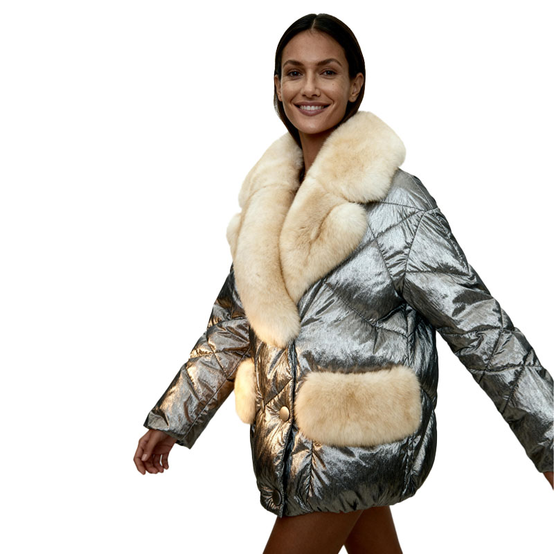 Metallic Silver Down Jacket with Cream Fox Fur Trim