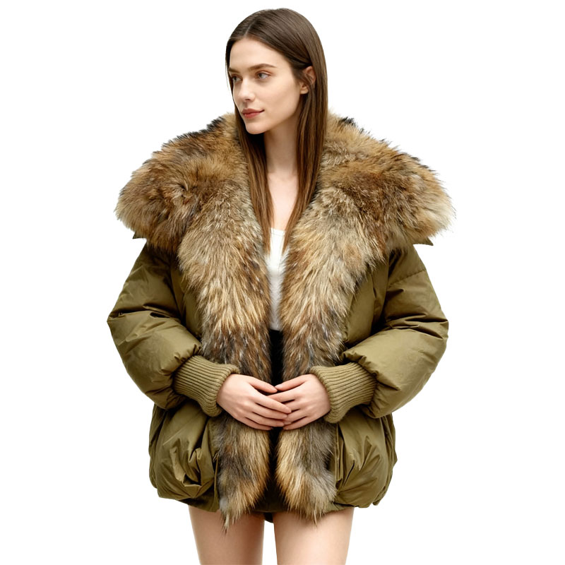 This mid-length puffer features a durable matte shell in an earthy olive hue, filled with premium down for uncompromising insulation. The dramatic raccoon fur collar drapes thickly around the neckline and down the front, creating natural contrast and volume. Ribbed cuffs and roomy pockets complete the blend of function and finesse.