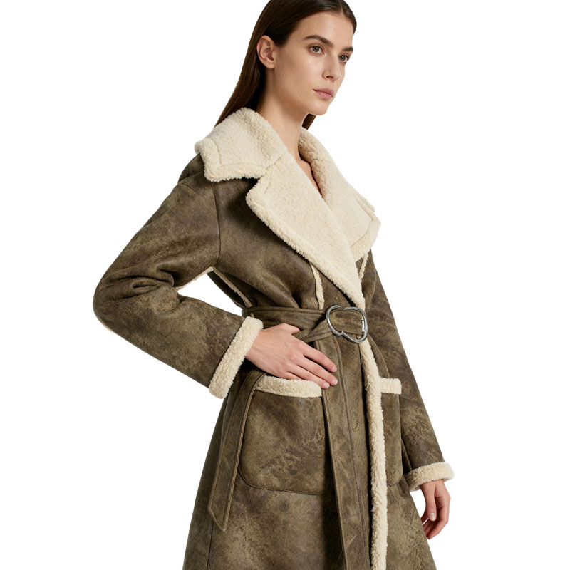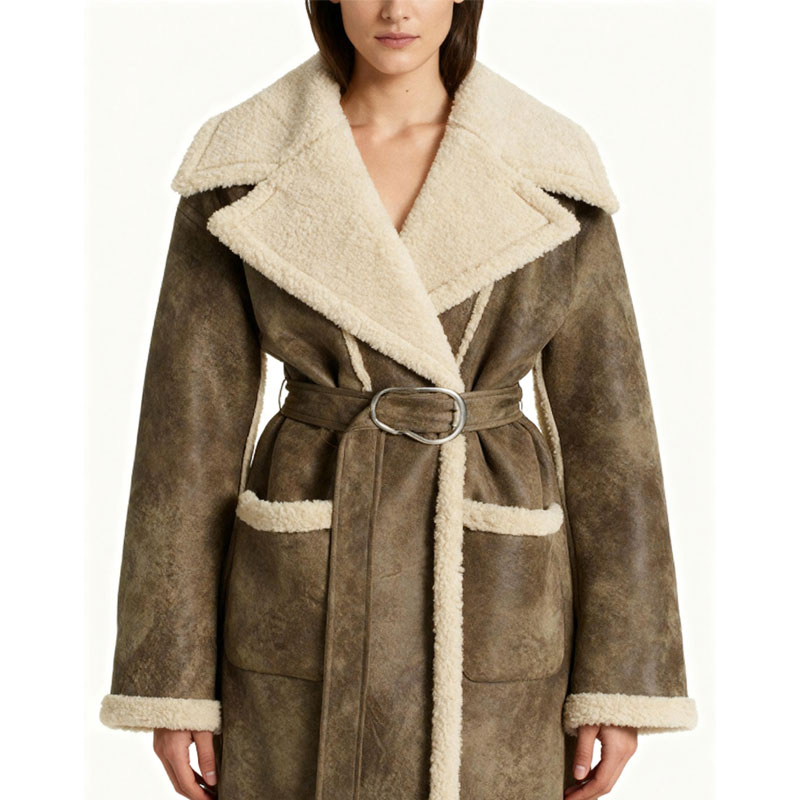 This women’s long coat is crafted from natural double-faced sheepskin, showcasing a smooth suede outer surface and plush shearling on the lapel, cuffs, and lining. With a belted waist and oversized lapels, this piece offers a flattering silhouette and high thermal performance for cold-weather fashion collections.