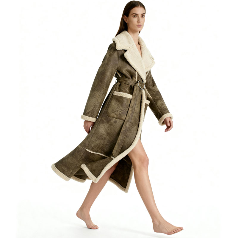 A vintage-inspired long shearling coat combining rustic charm with contemporary tailoring. Featuring an earthy olive-grey suede exterior and soft cream sheep fur trim, it’s built for both comfort and sophistication in winter wardrobes.